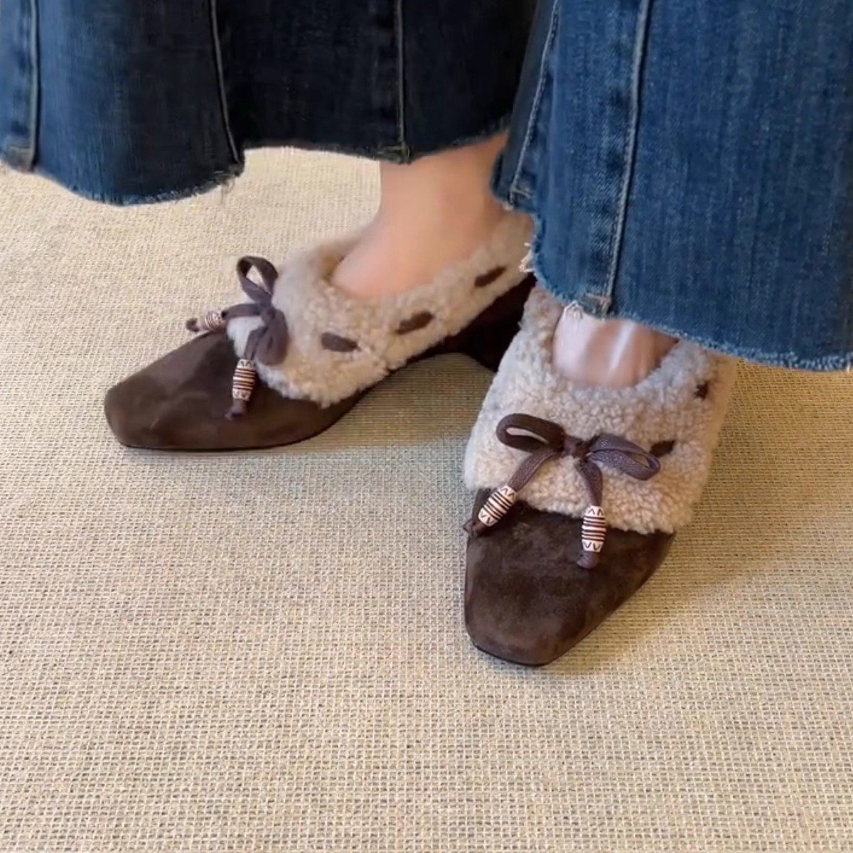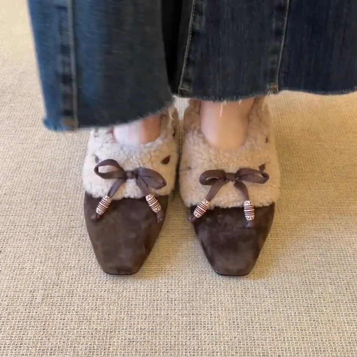 2025新款法式羊羔毛方头浅口单鞋女内增高绒面蝴蝶结加绒毛毛棉鞋