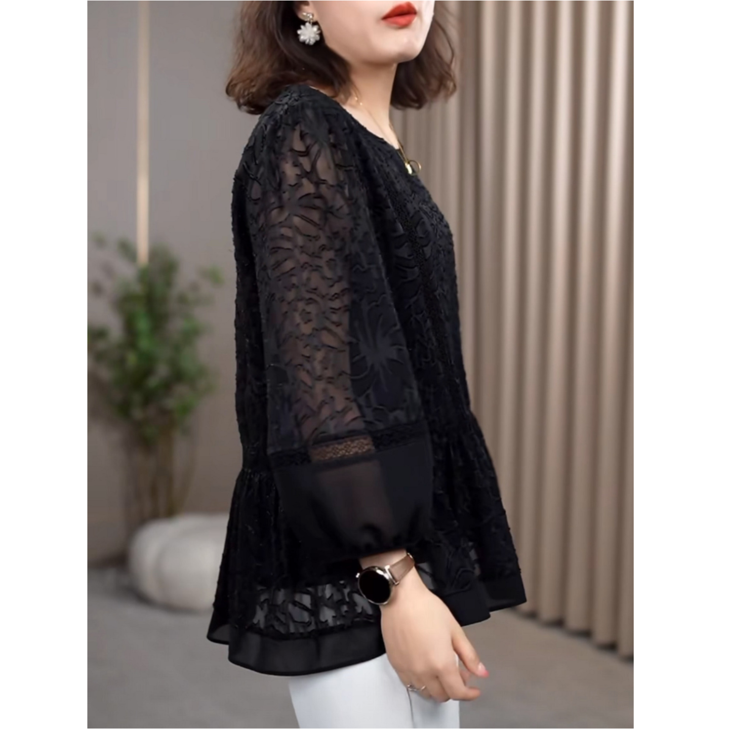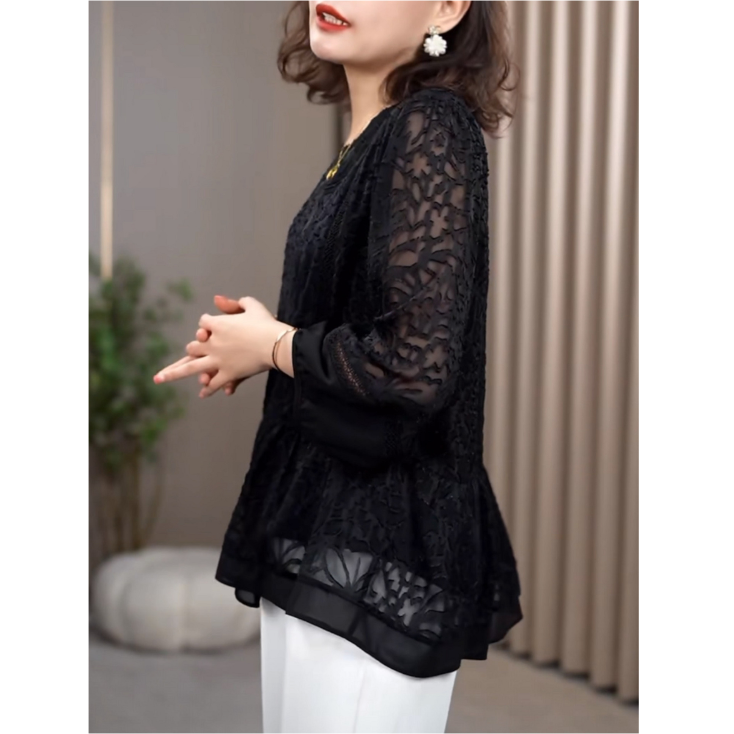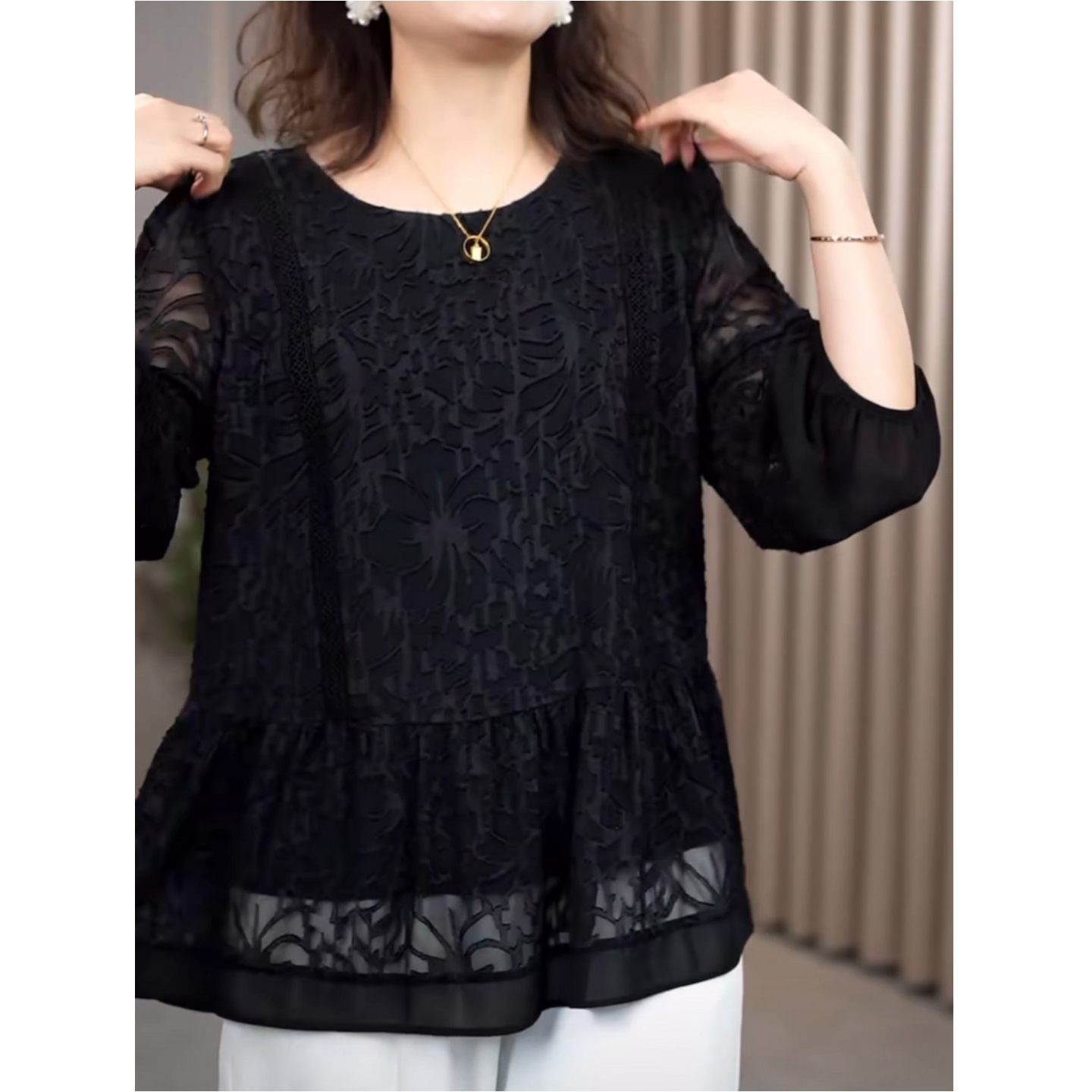 2026早春新款高端蕾丝拼接黑色九分袖上衣灯笼袖洋气百搭显瘦小衫
