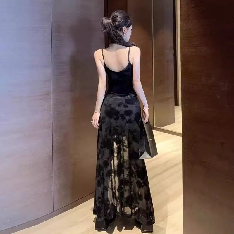 法式黑色蕾丝吊带连衣裙大码300斤纯欲修身开叉辣妹长裙气质裙子