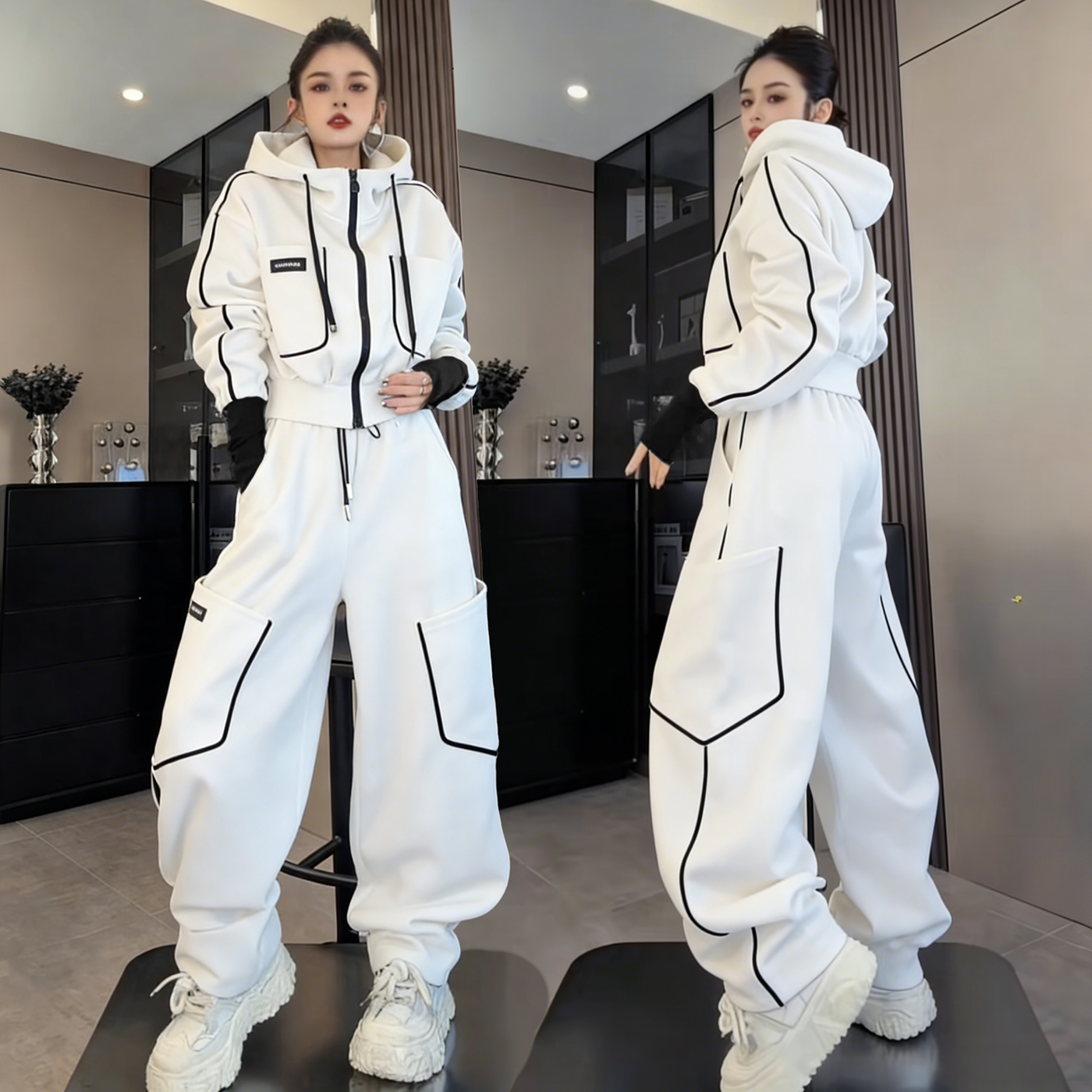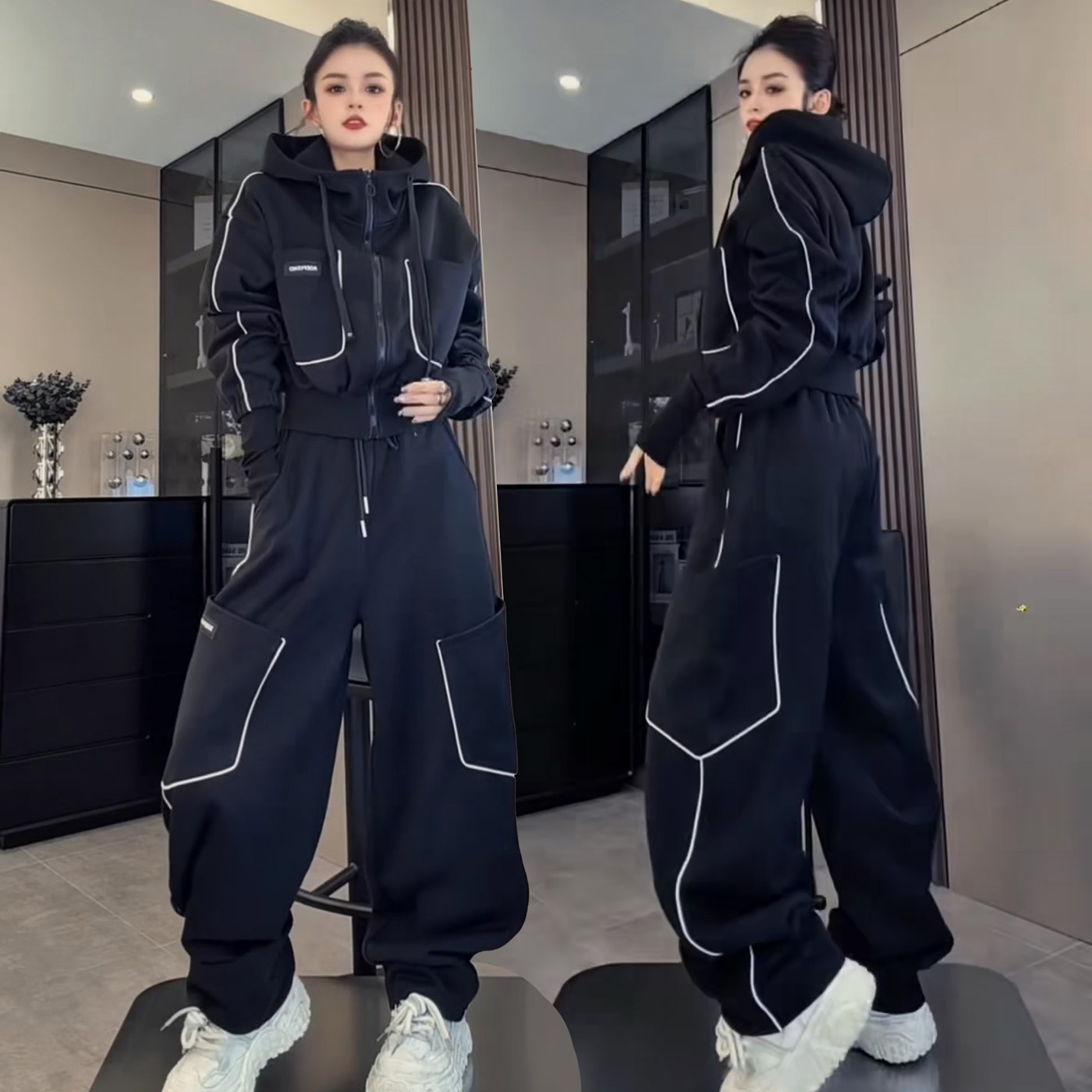 2026春秋新款休闲运动套装女款撞色宽松连帽卫衣阔腿工装裤两件套