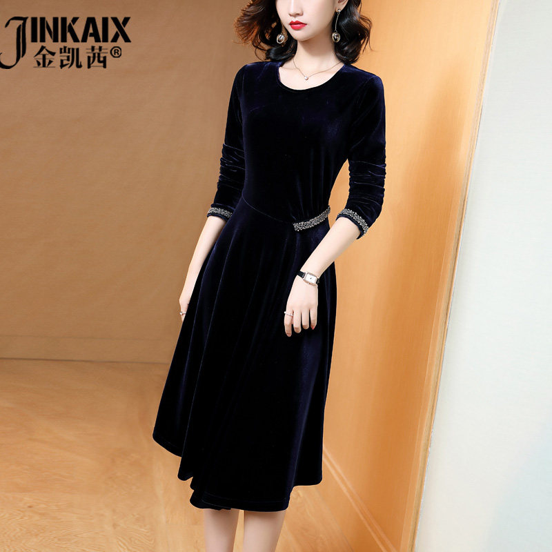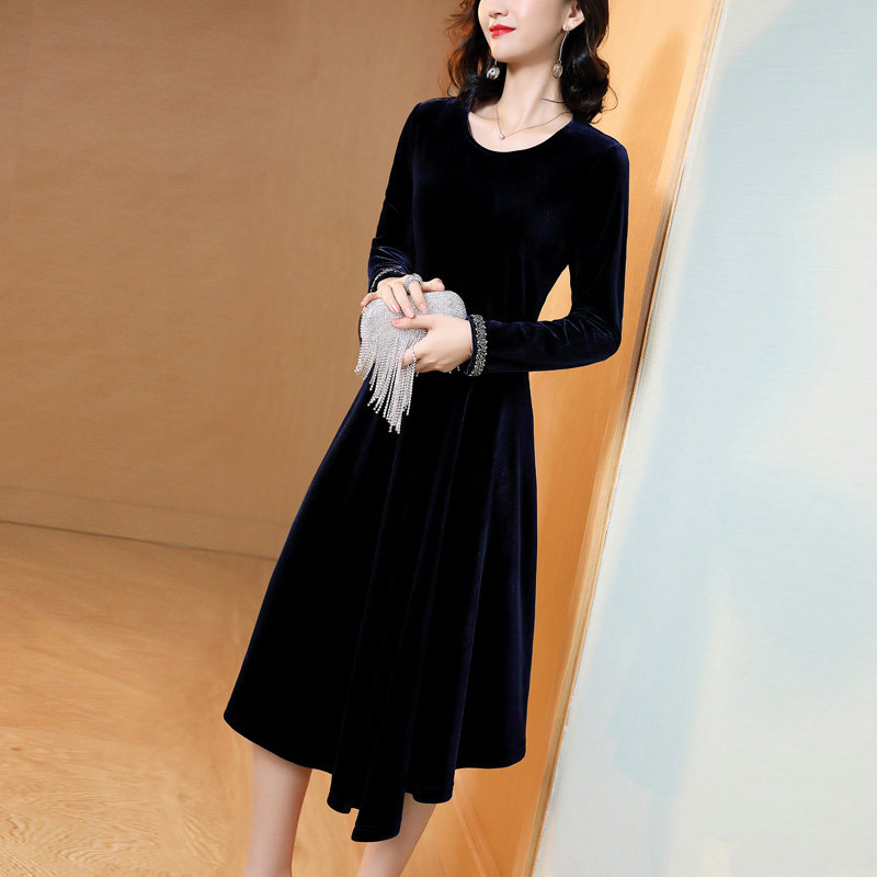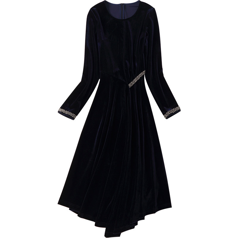 311线报网描述:秋冬长袖金丝绒收腰钉珠连衣裙
