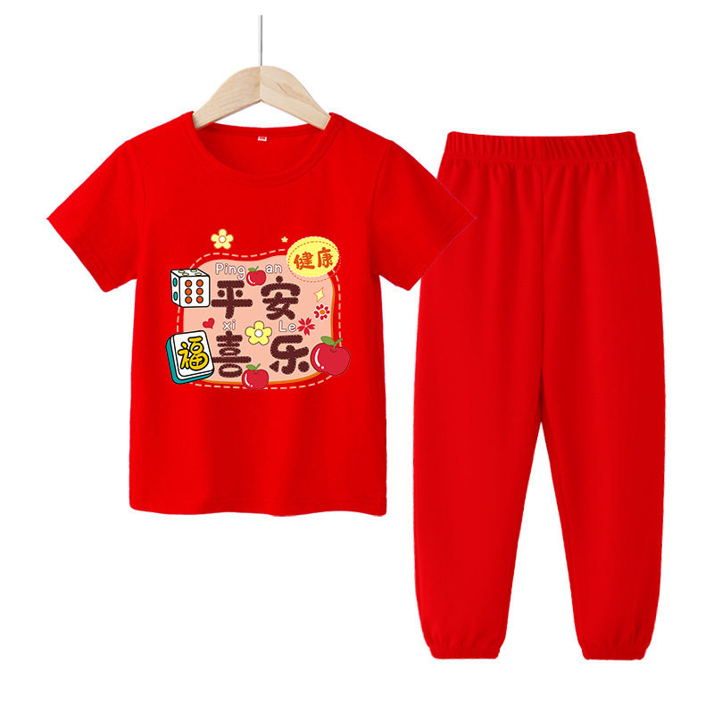 儿童红色短袖套装居家服纯棉男童女童马年本命年衣服兄妹装姐弟装