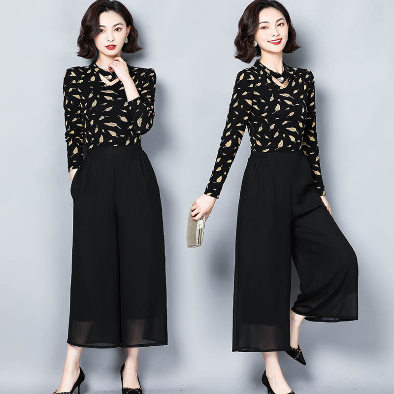 雪纺阔腿裤套装女2019新款秋冬装休闲时尚显瘦气质宽松裤子两件套