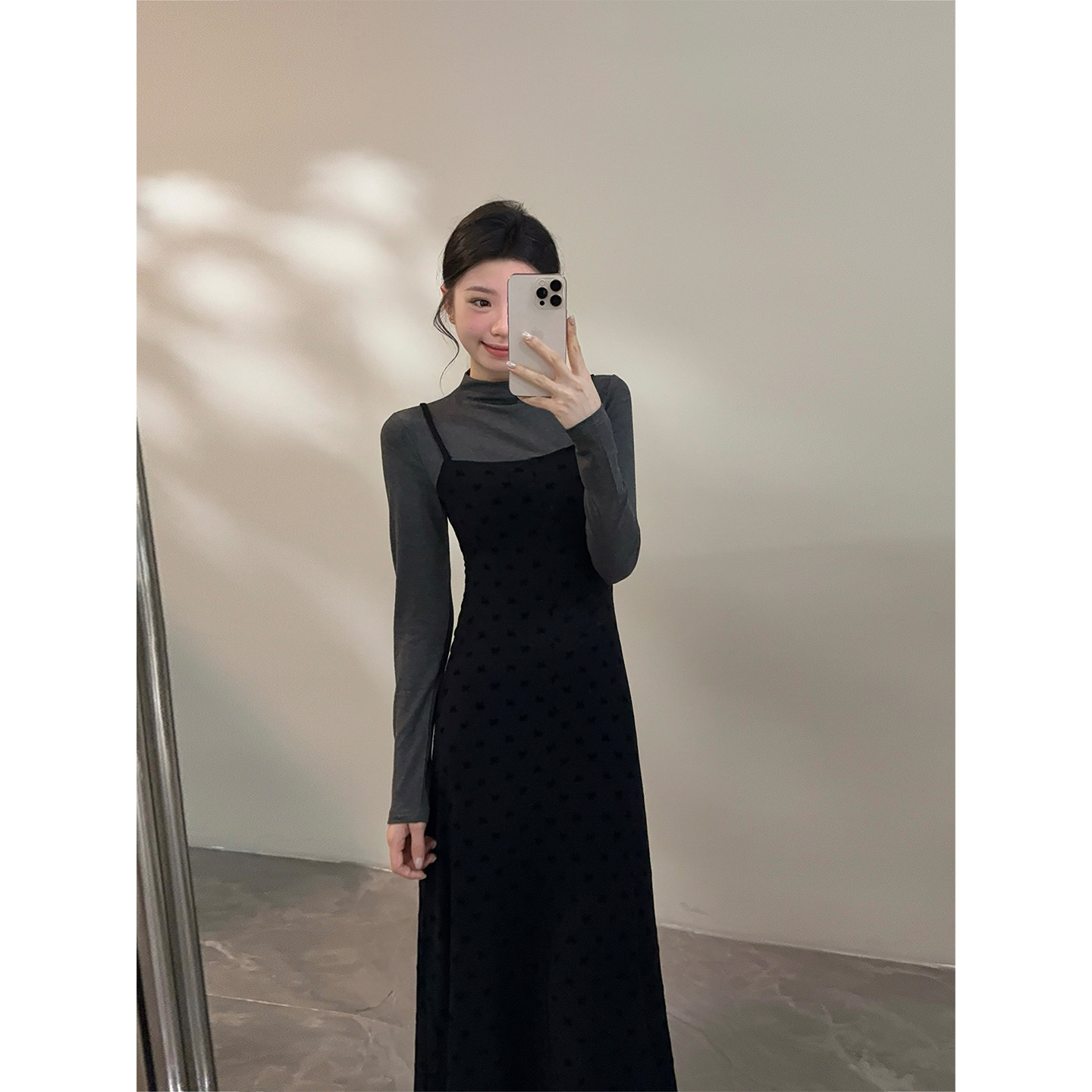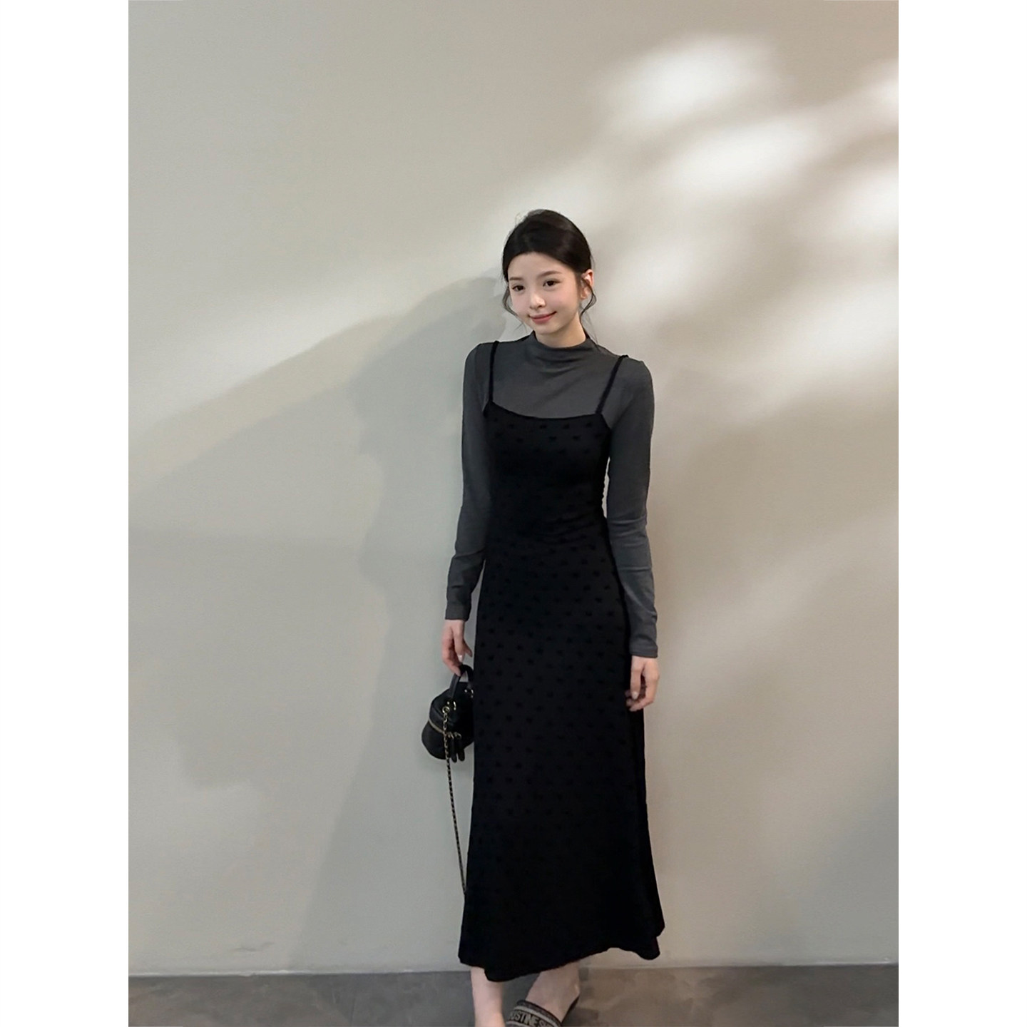颂宋 秋季法式假两件半高领长袖针织连衣裙显瘦气质长裙DT1567