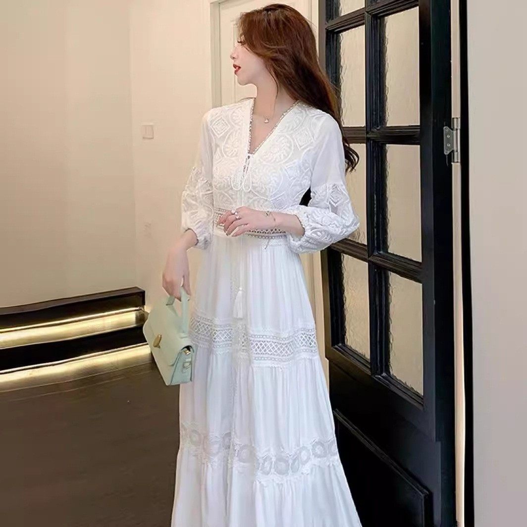 春秋民族风新款白色长袖蕾丝度假沙滩裙V领气质长裙超仙连衣裙女