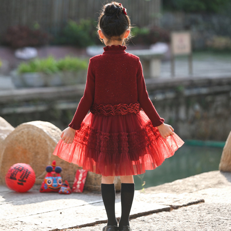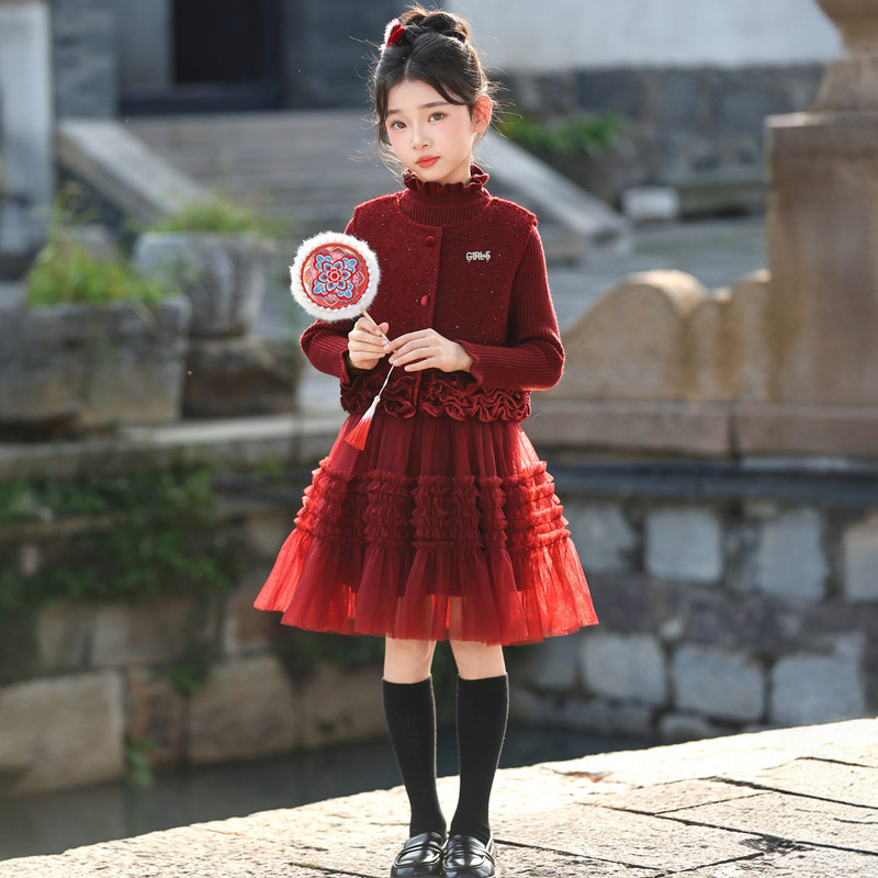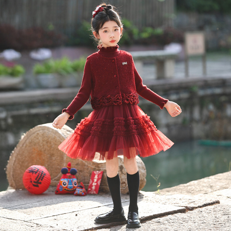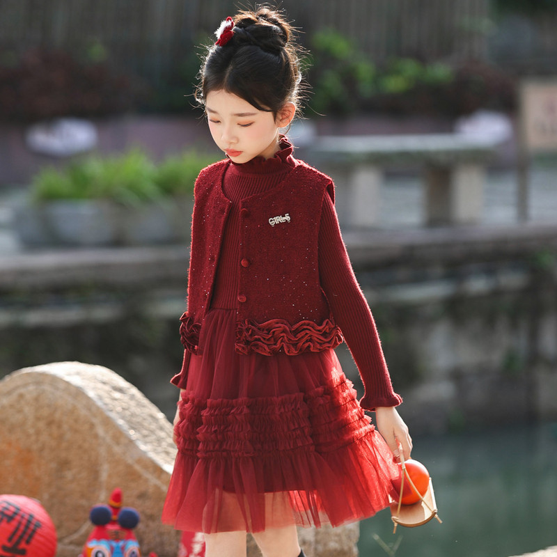 女童连衣裙新年服装冬装套装2025新款大童洋气时髦小香风红色冬裙