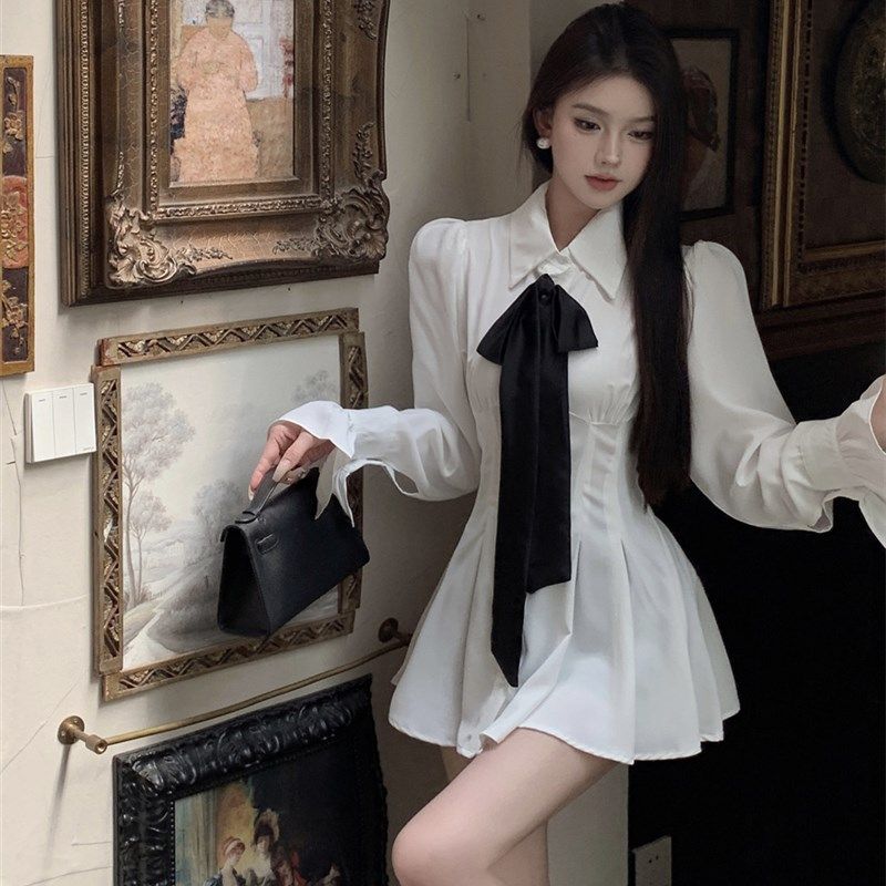 法式温柔长袖衬衫连衣裙女秋季白色缎面裙子收腰修身气质a字短裙