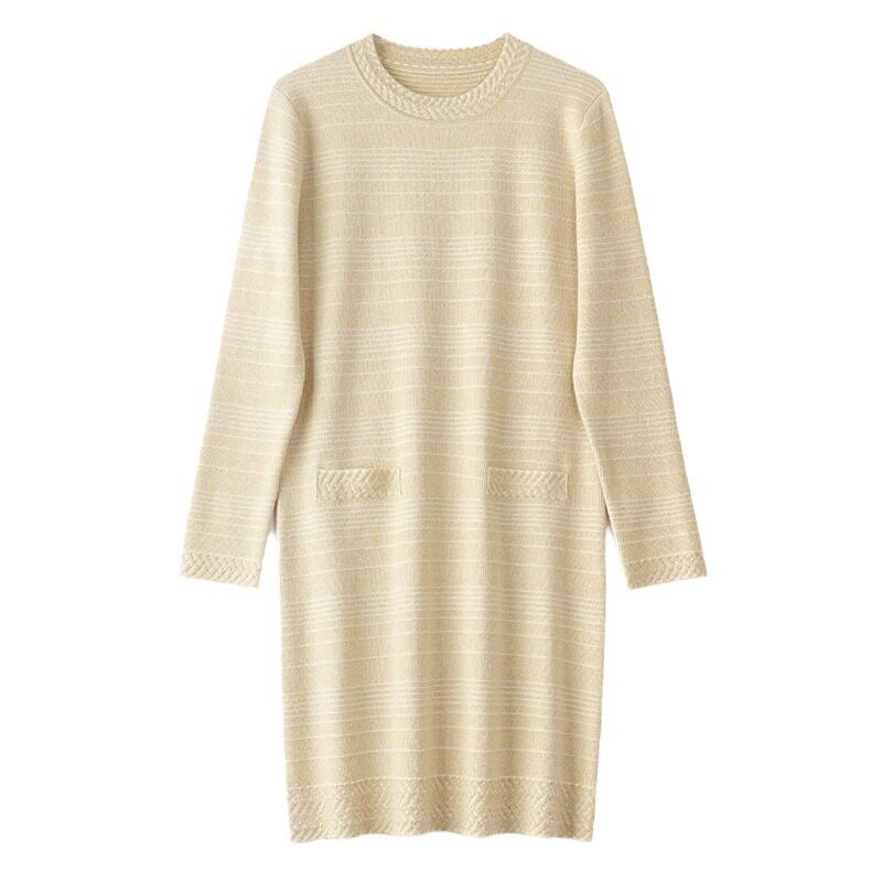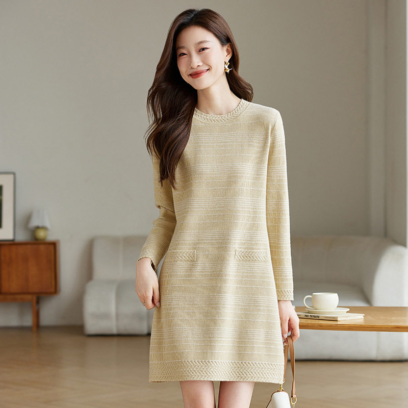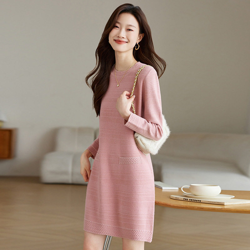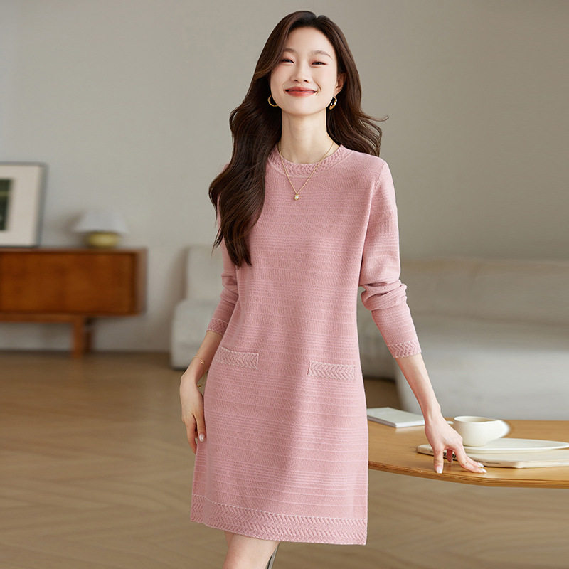 2026新款口袋宽松遮肉连衣裙女士春秋休闲百搭圆领长袖打底毛衣
