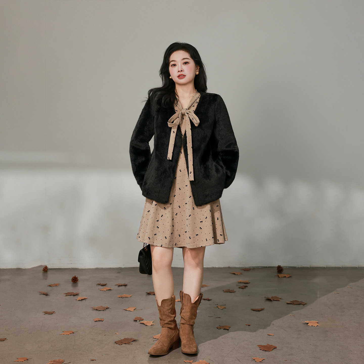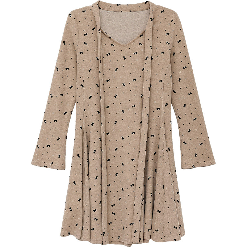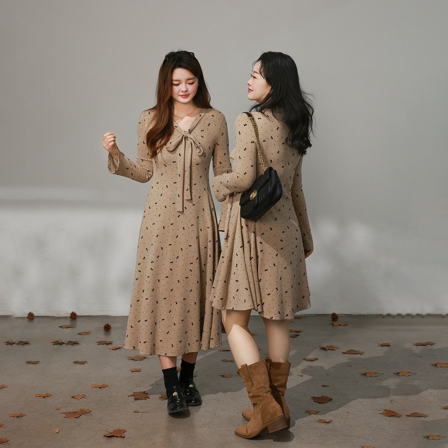 大码百分百女装微胖mm冬季长短款V领系带蝴蝶结波点连衣裙