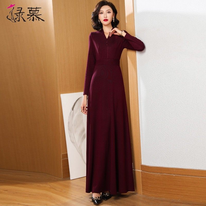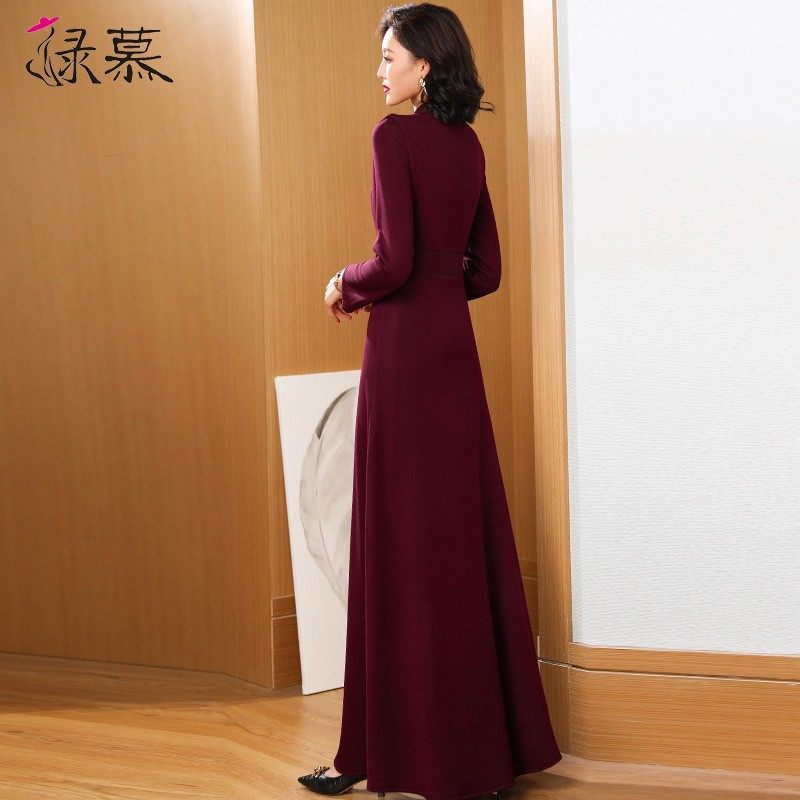 酒红色加绒加厚连衣裙修身长款2021冬季新款气质高端长裙到脚踝