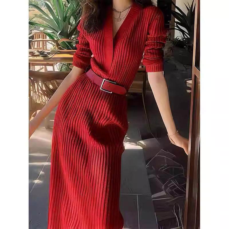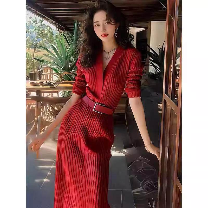 欧洲站红色针织长款裙子2025秋冬新款御姐高级感收腰打底连衣裙女