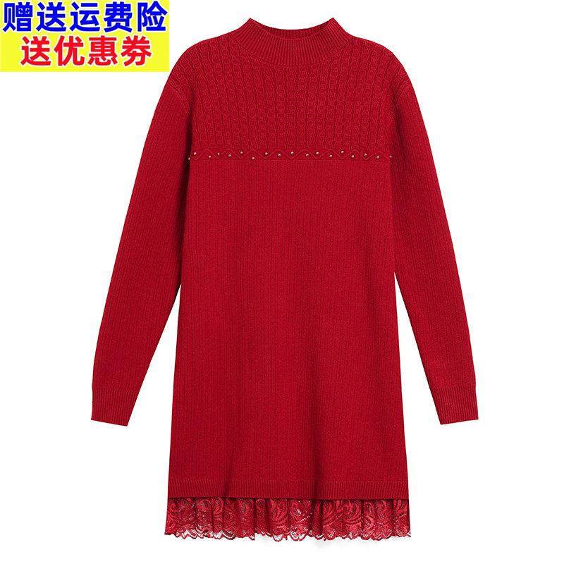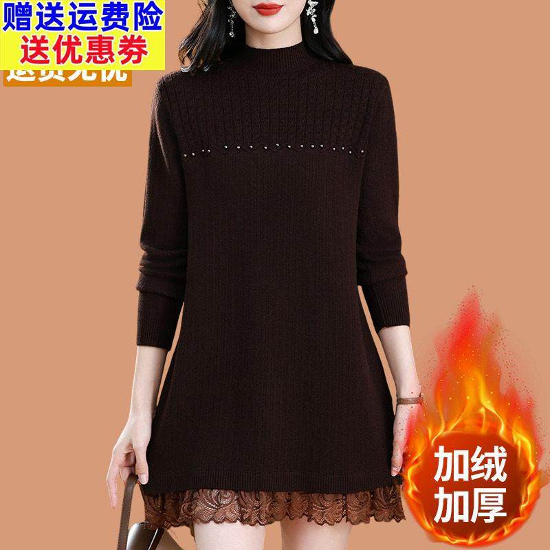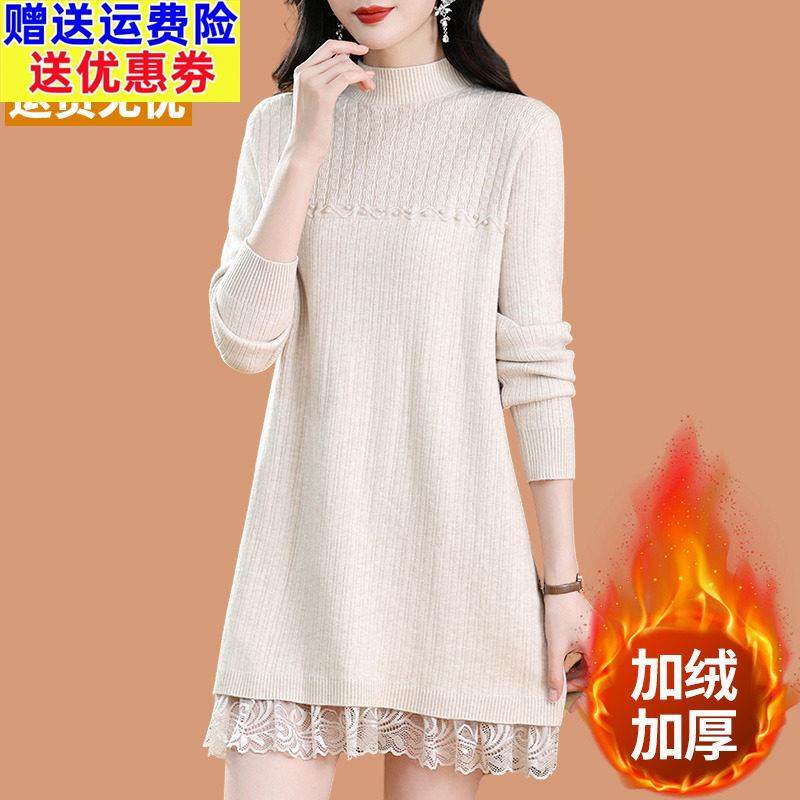 秋冬新款针织连衣裙女一体加绒加厚毛衣中长款内搭蕾丝打底羊毛衫