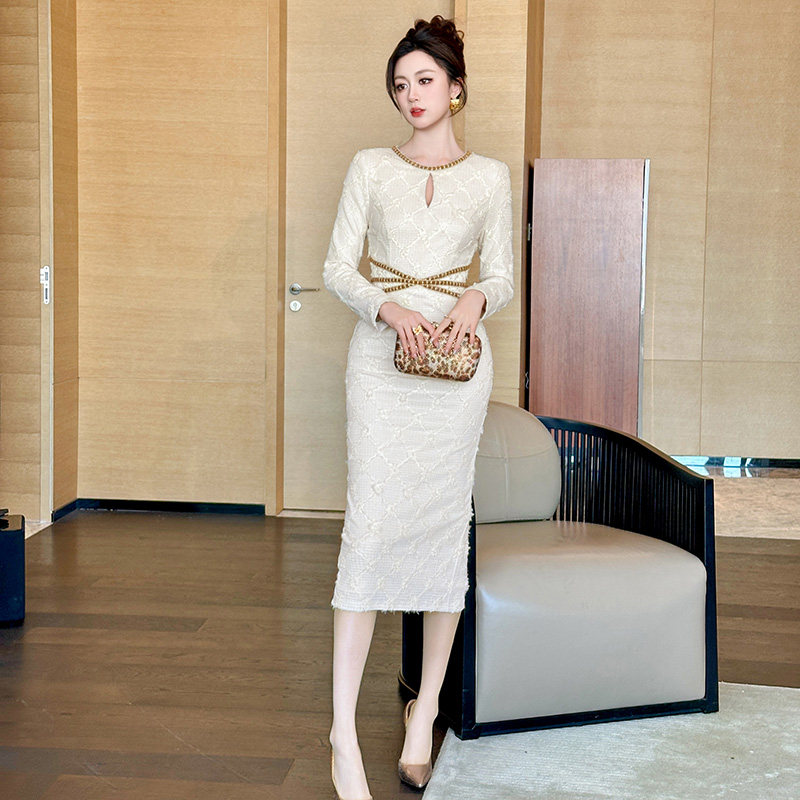白色连衣裙女冬季法式气质小香风设计感修身打底内搭包臀裙长裙子