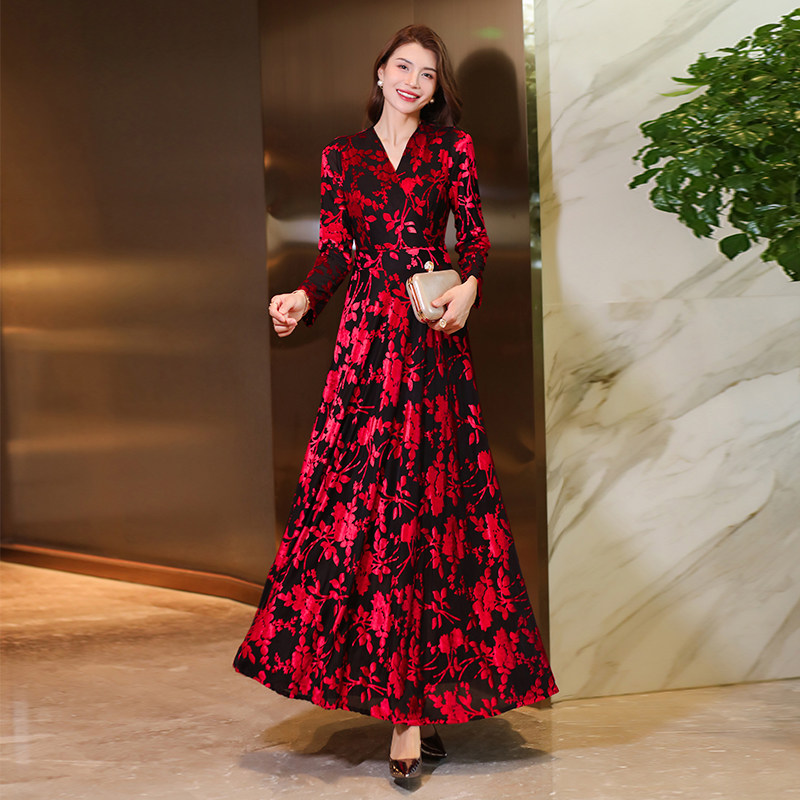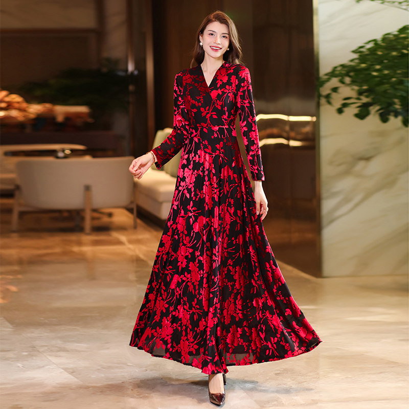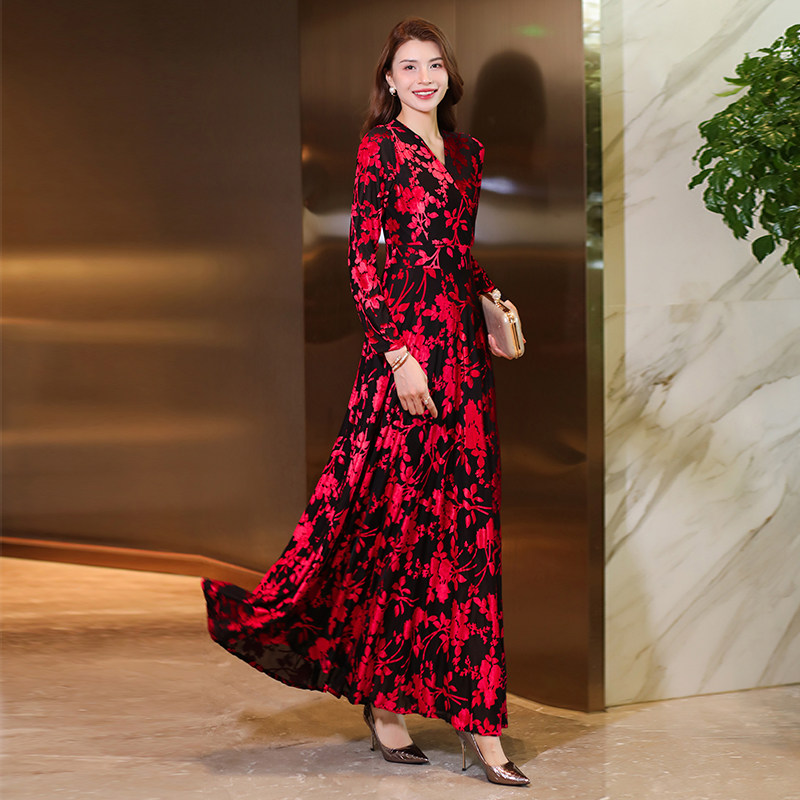 长袖连衣裙女2023秋季新款植绒刺绣长款到脚踝超长气质大摆长裙