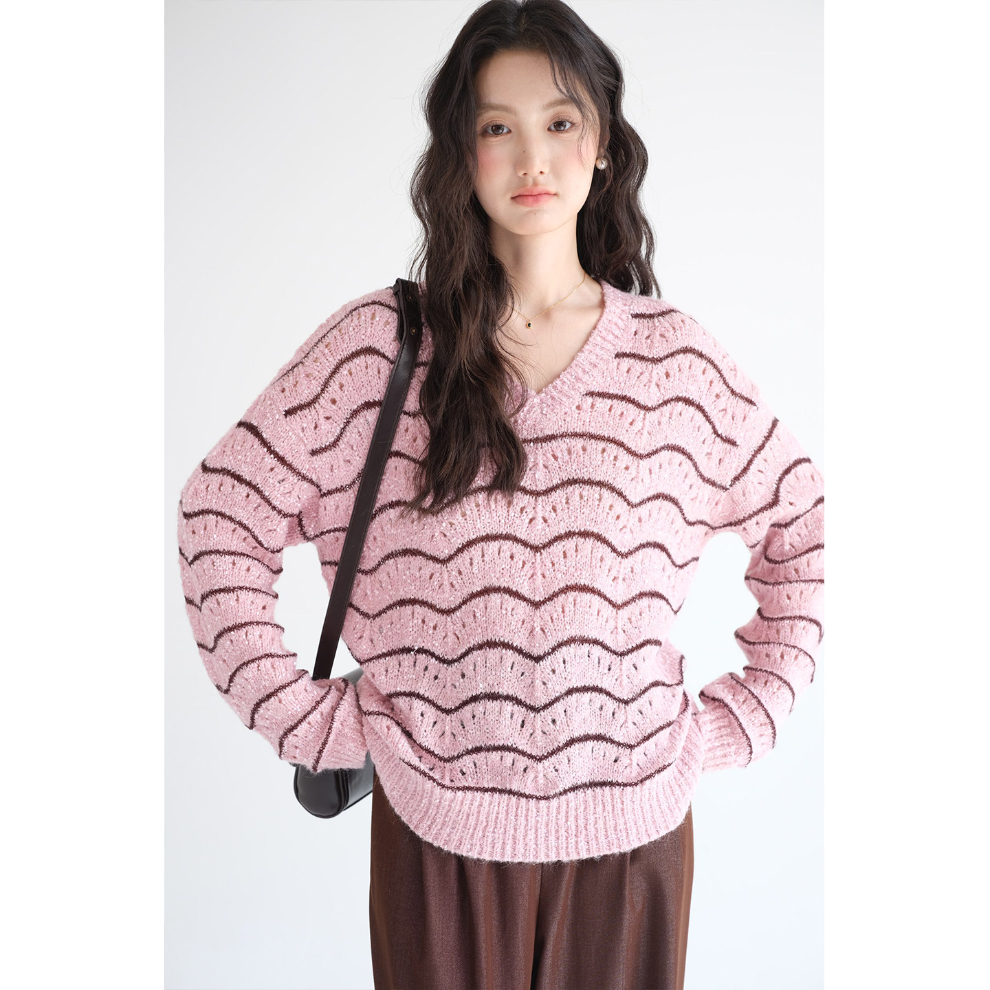 311线报网描述:设计感镂空波浪纹V领针织衫遮肚子甜美毛衣