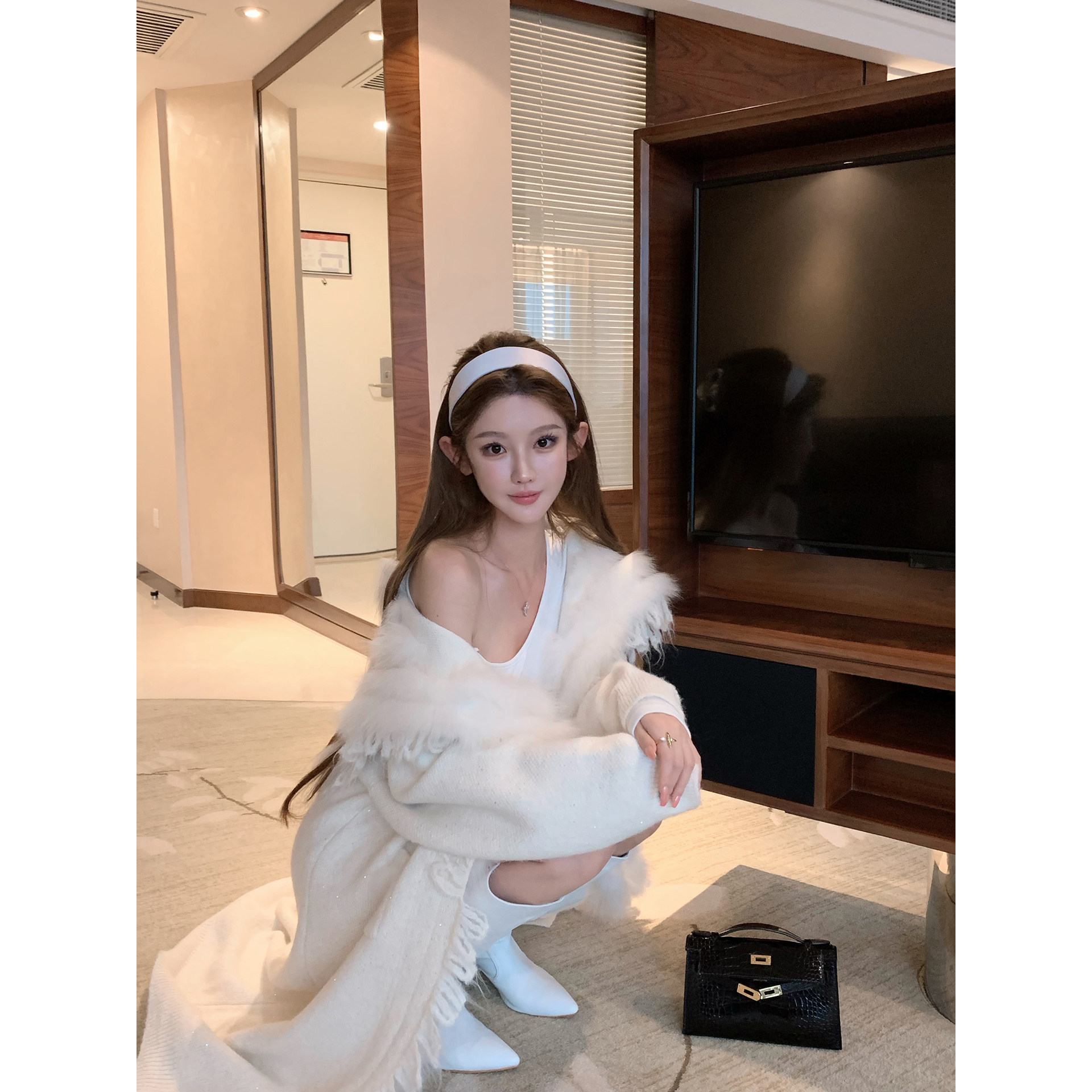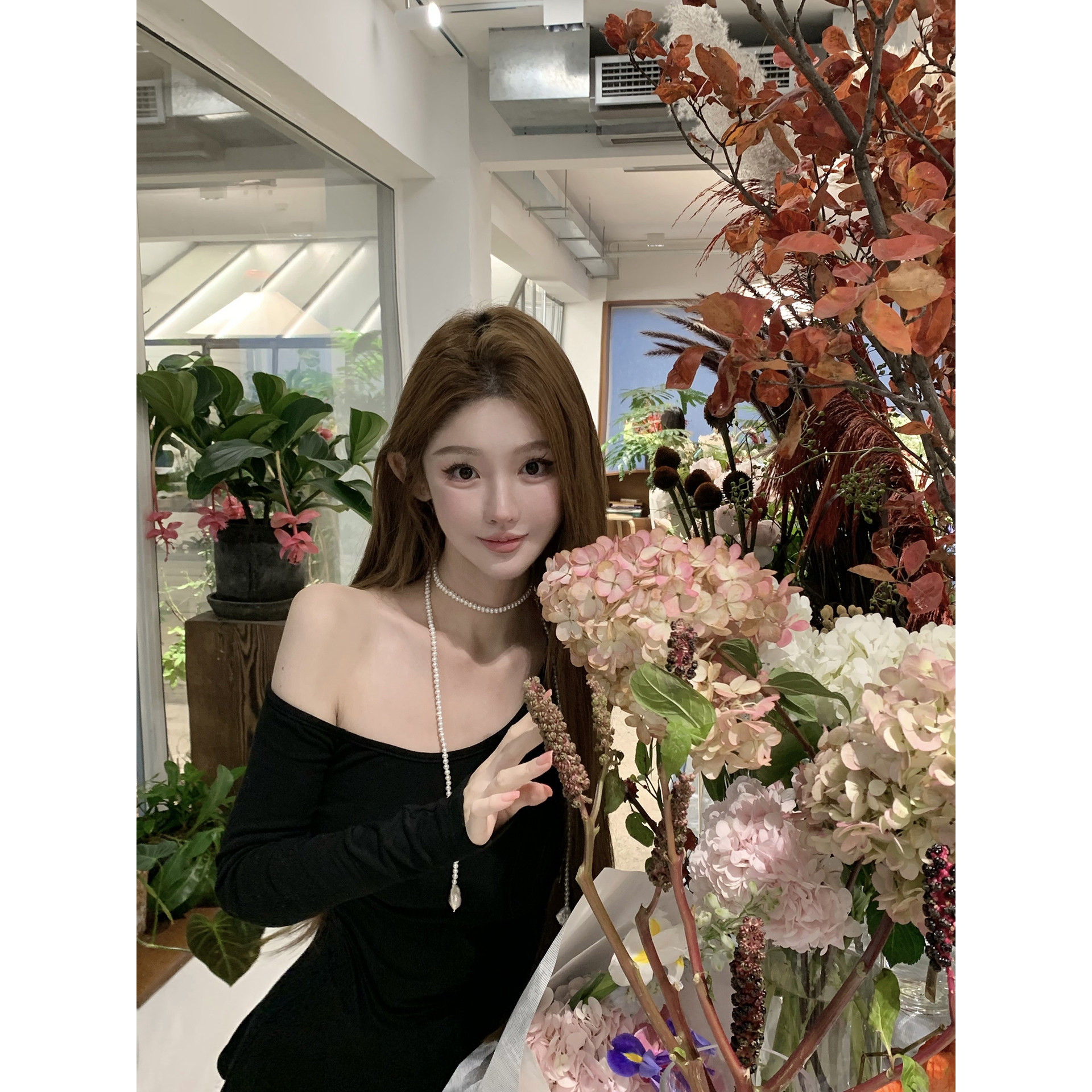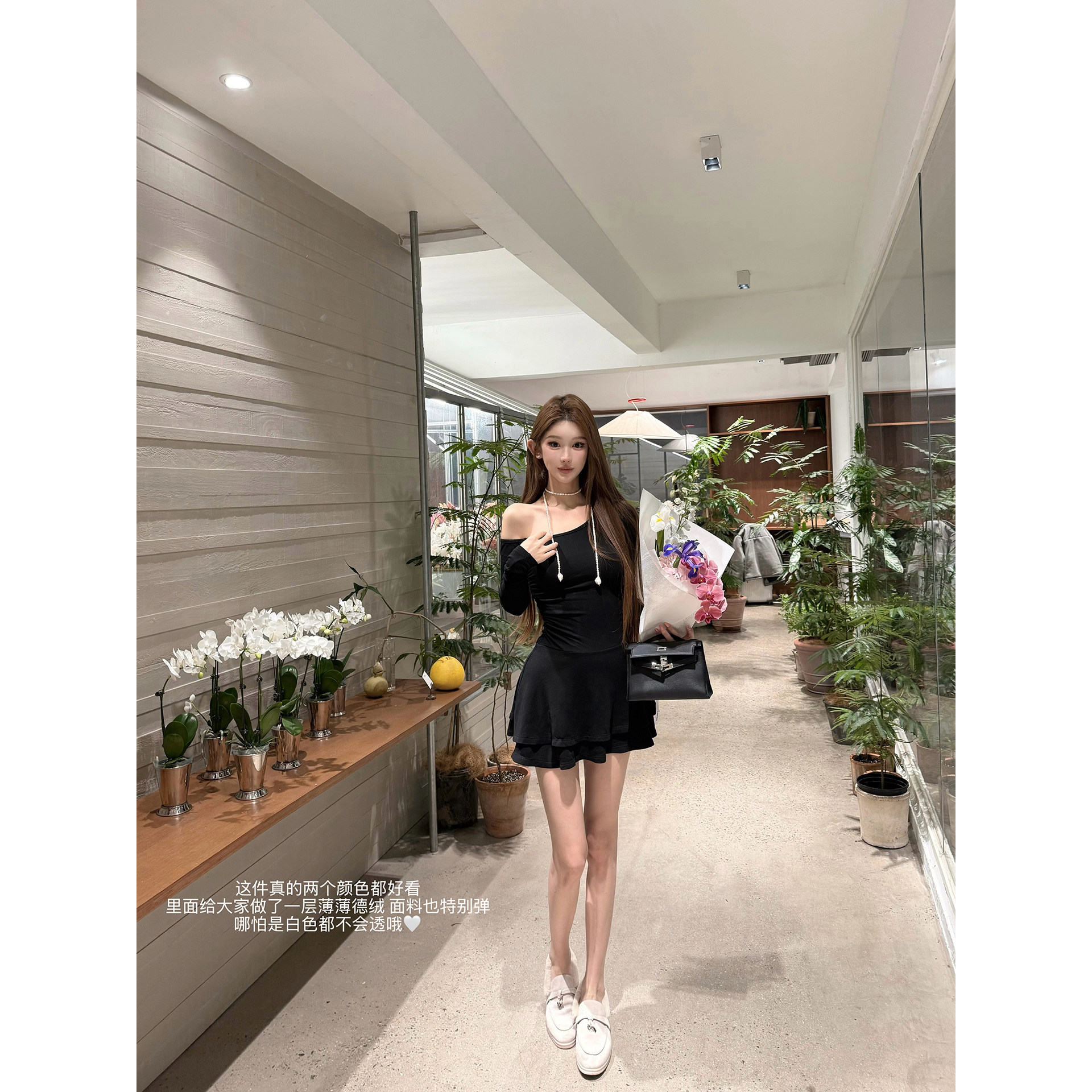 JOEY纯欲内搭天才秋冬黑白色冬天配大衣的裙子德绒双层斜肩连衣裙