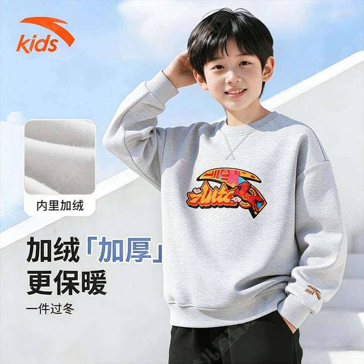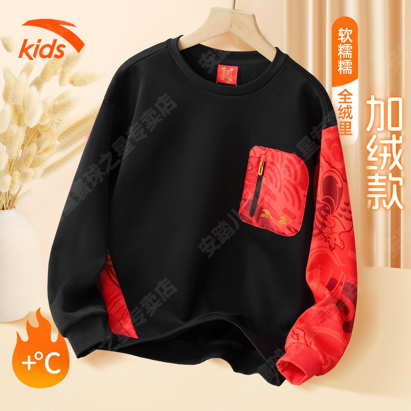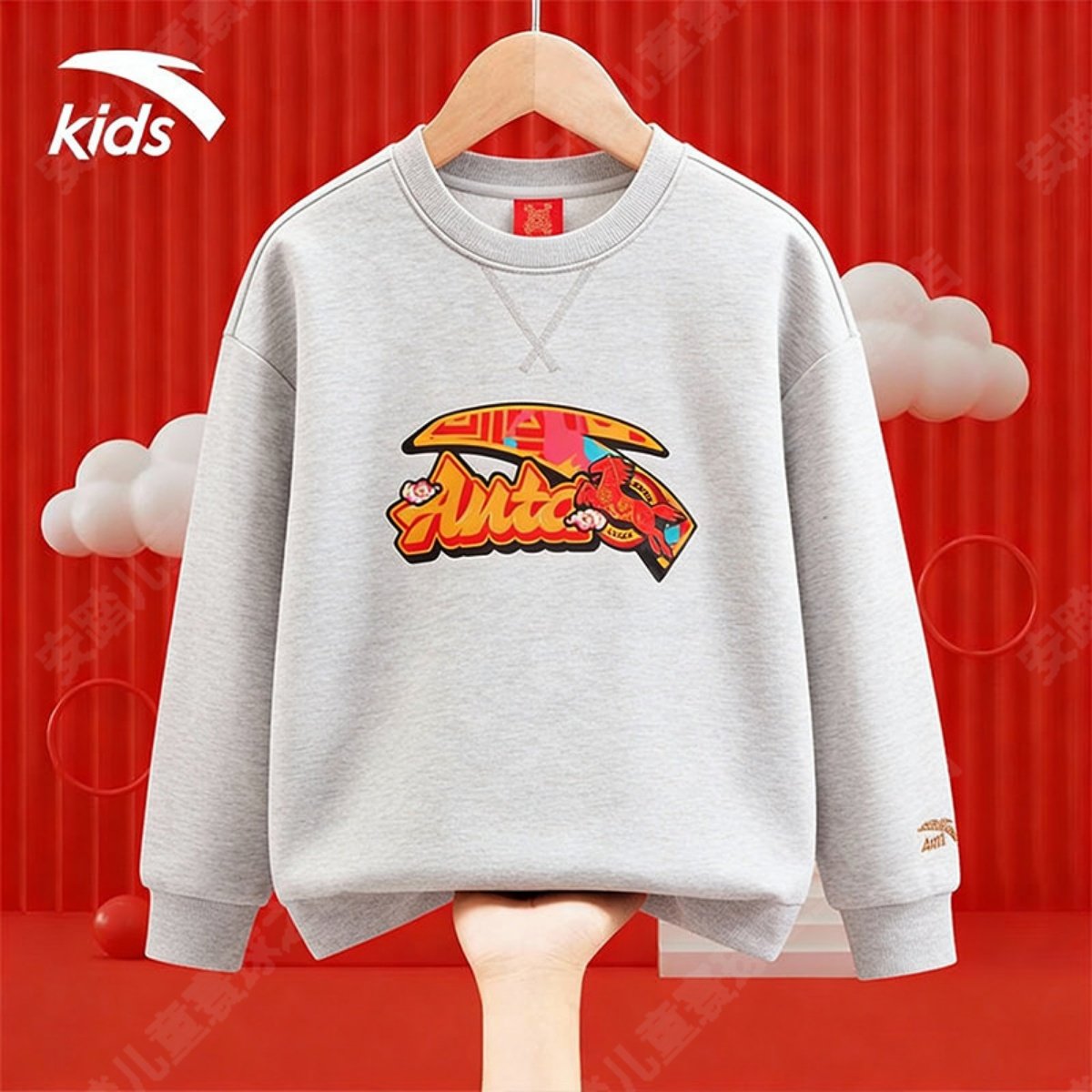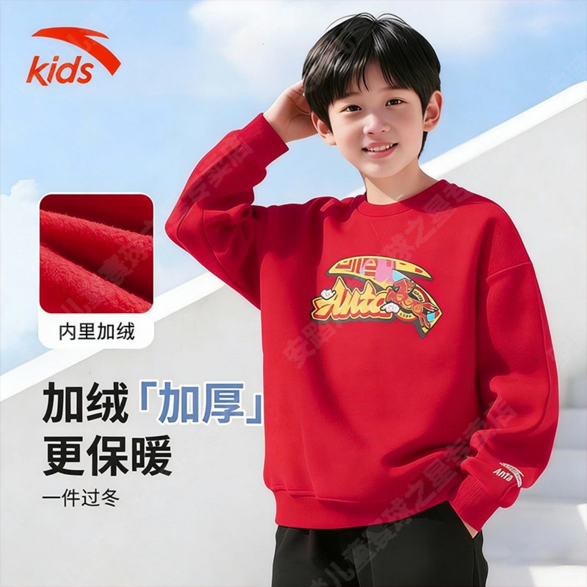 安踏儿童加绒卫衣男女大童2026新年红色套头衫本命年男童衣服秋冬