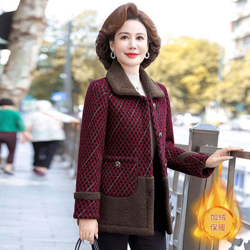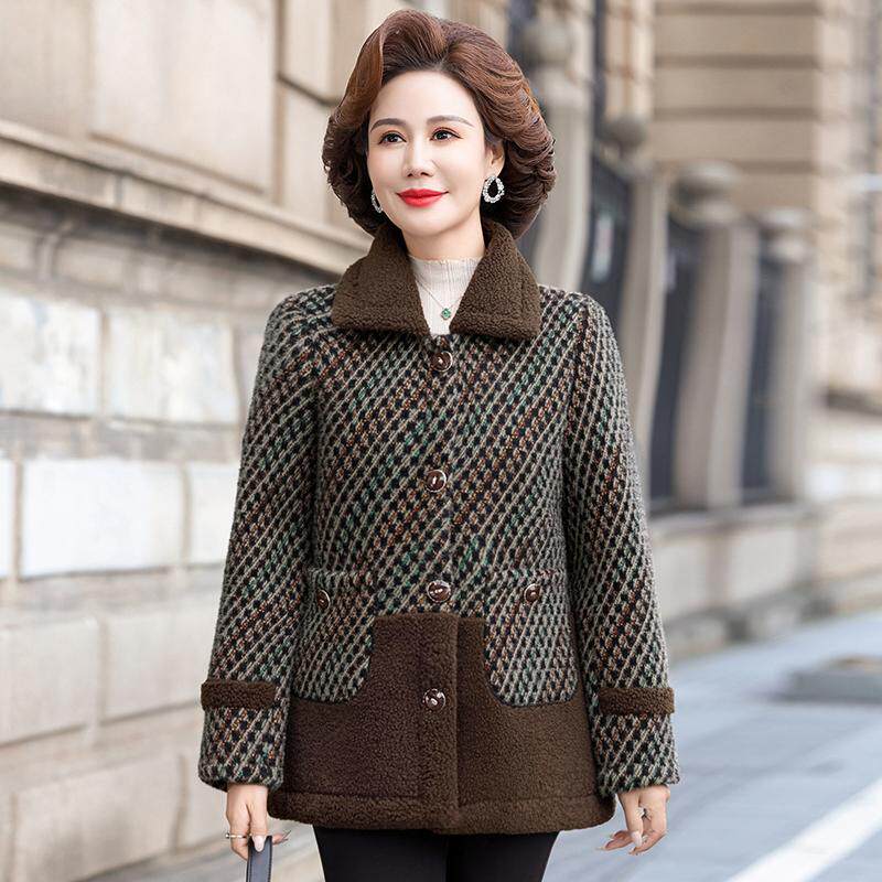 中年妈妈秋冬羊羔绒外套短款中老年女装冬装新款毛呢上衣加绒加厚