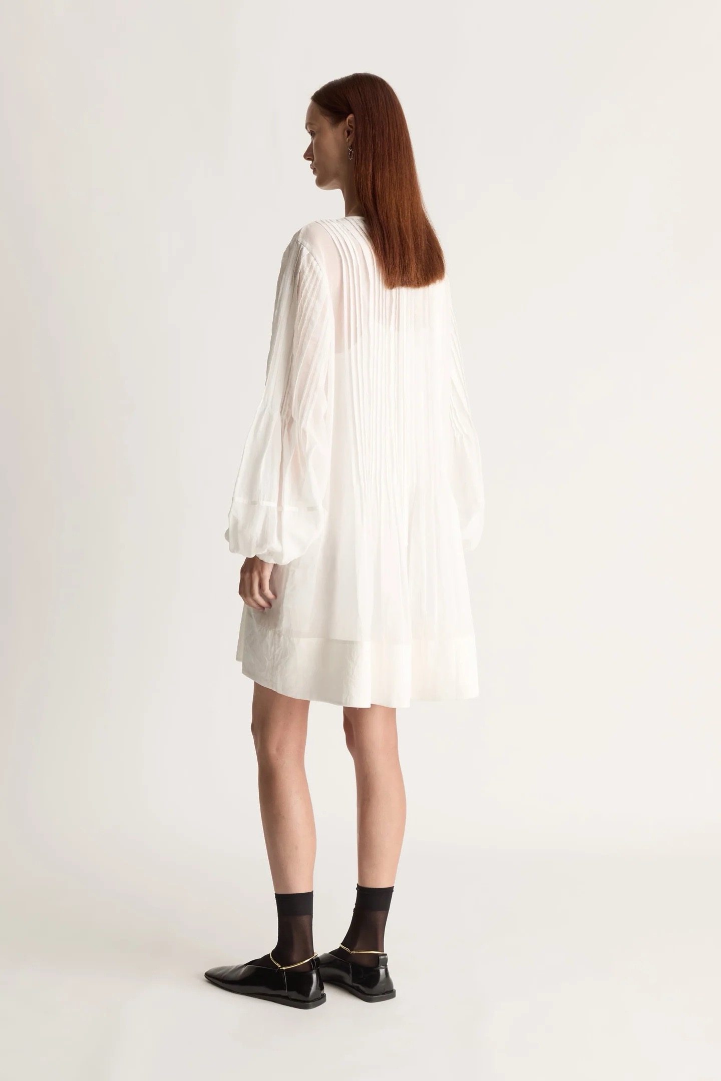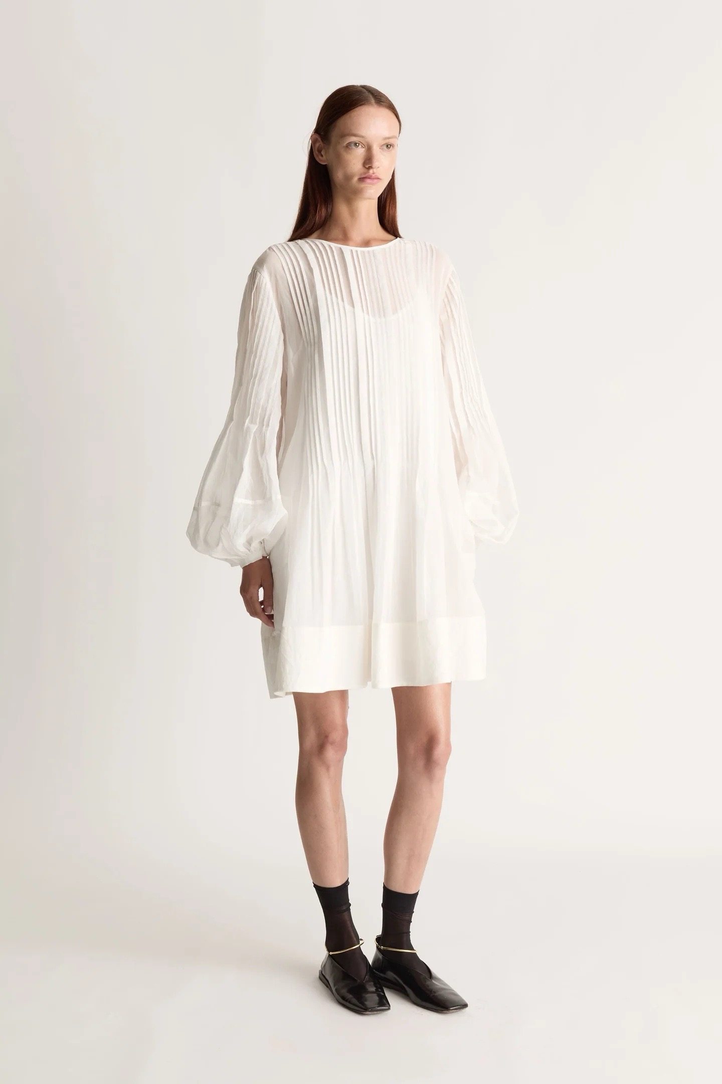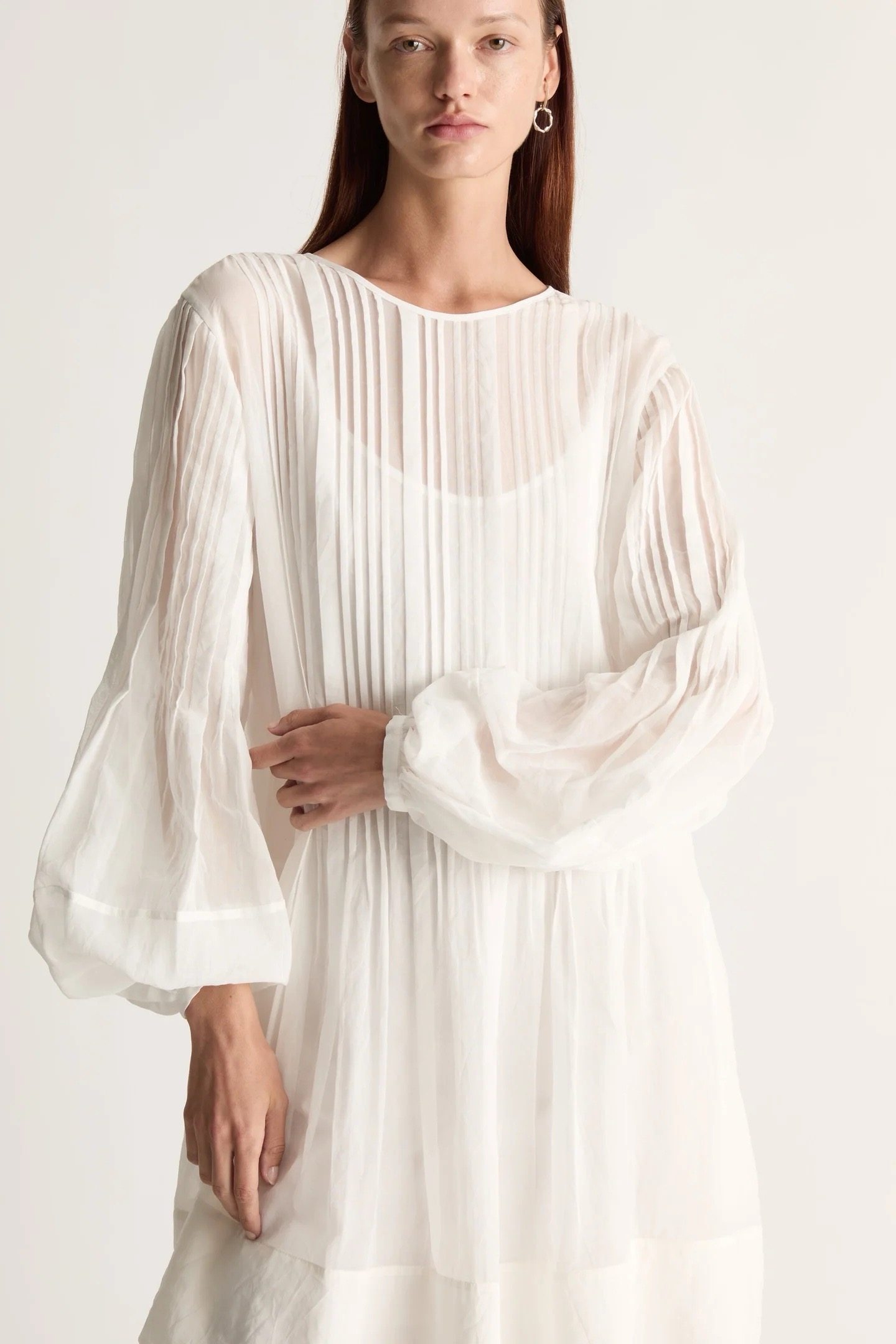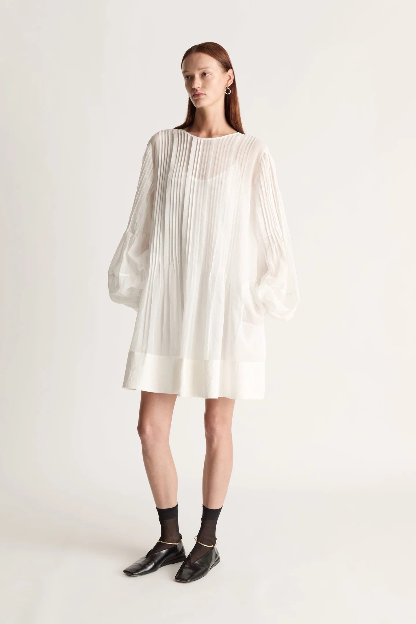 欧洲站棉质白色竖向打条灯笼袖宽松长袖连衣裙2026新款度假休闲