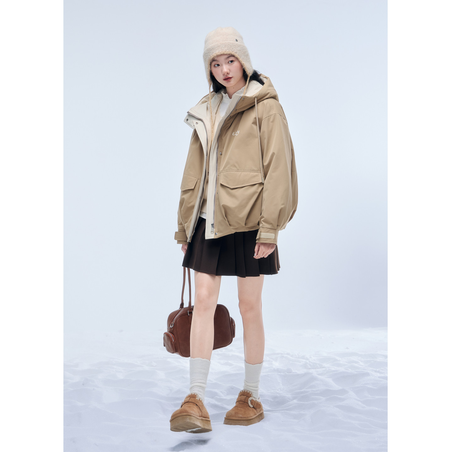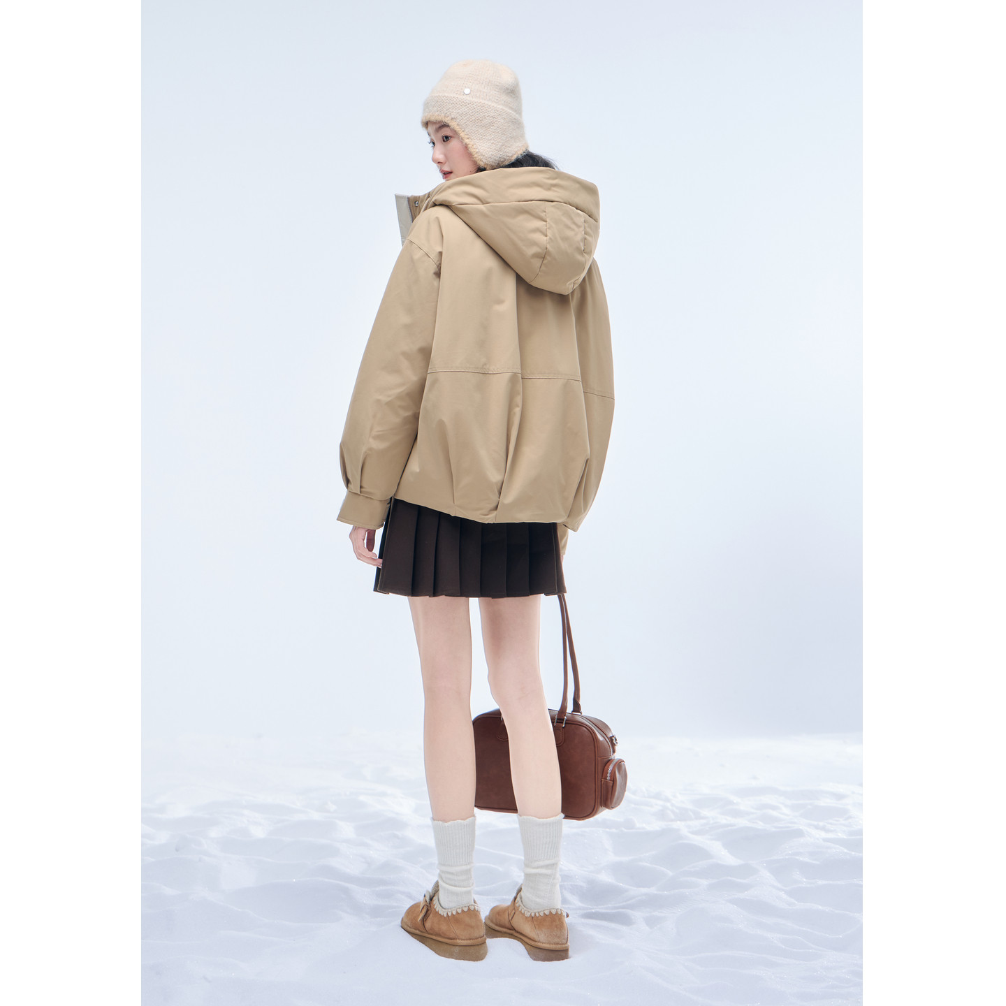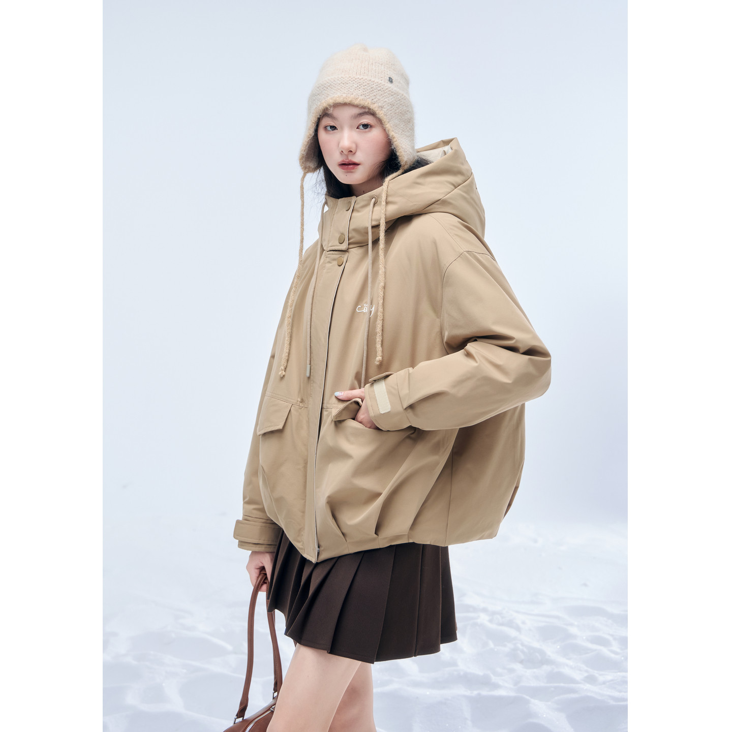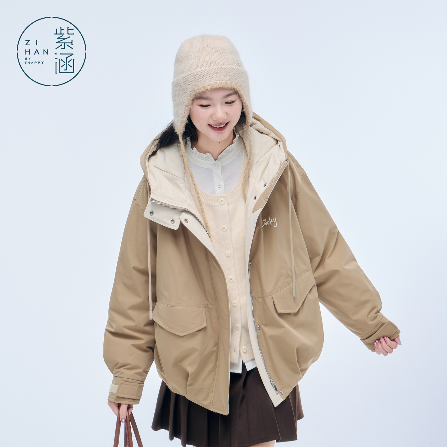 紫涵卡其色短款工装羽绒服女2025年冬季新款户外保暖连帽鸭绒外套