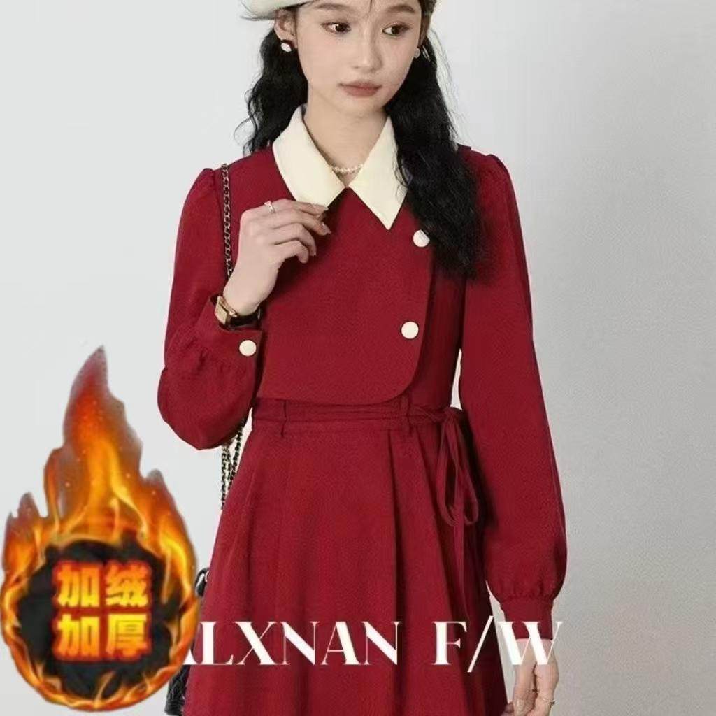 法式桔梗假两件连衣裙秋冬款长袖收腰显瘦连衣裙气质垂感通勤穿搭