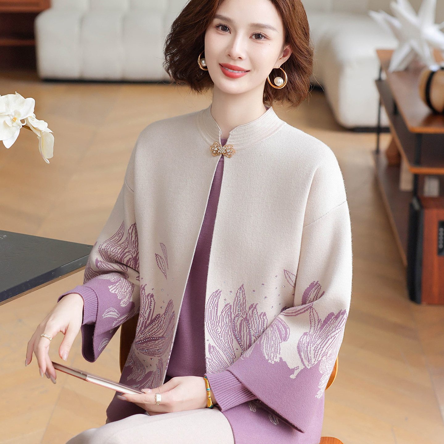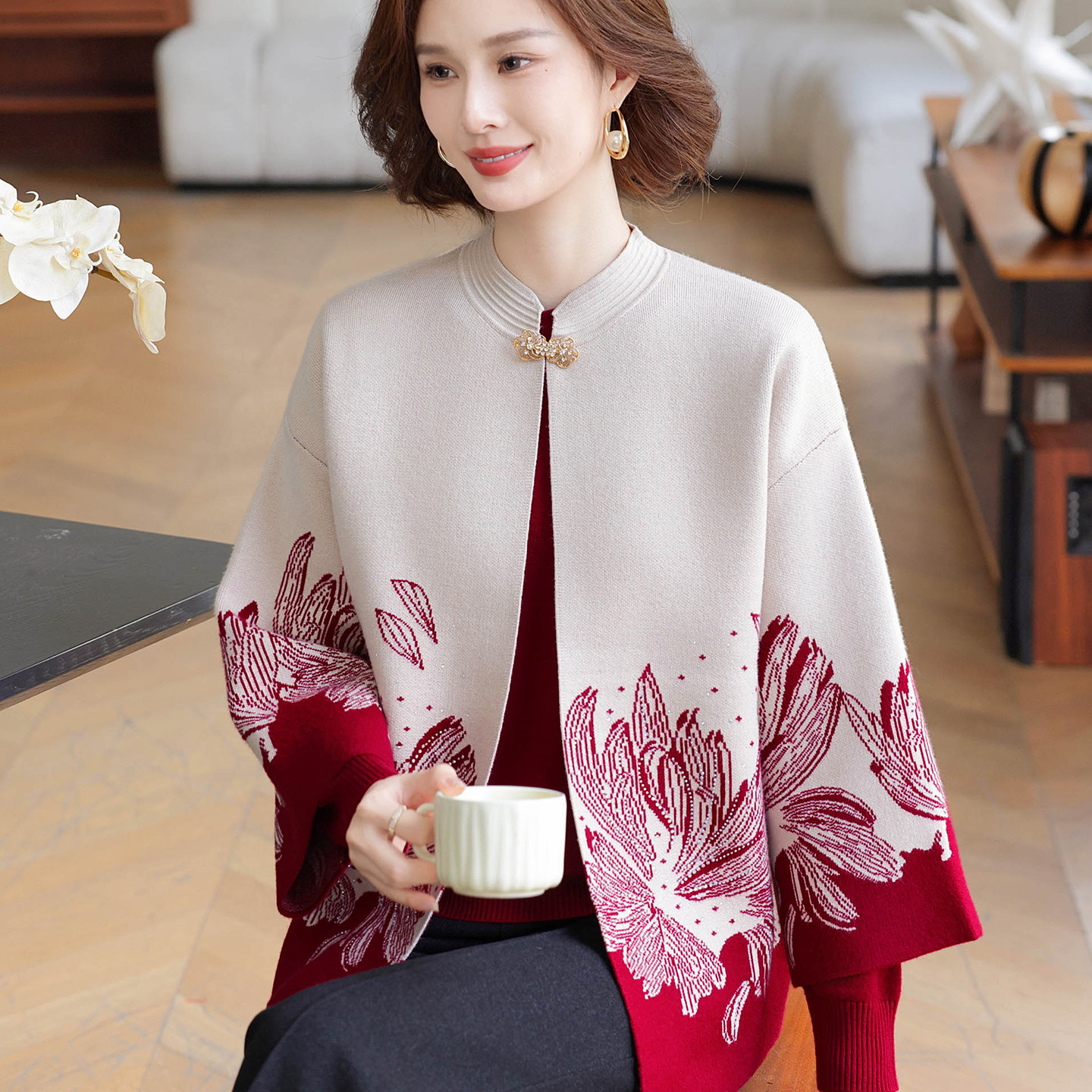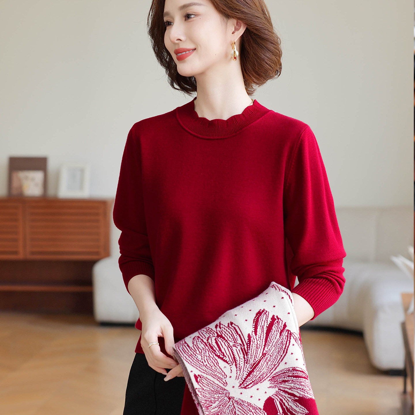 2025新款妈妈秋装中式衣服红色针织两件套中老年女装毛衫50岁外套