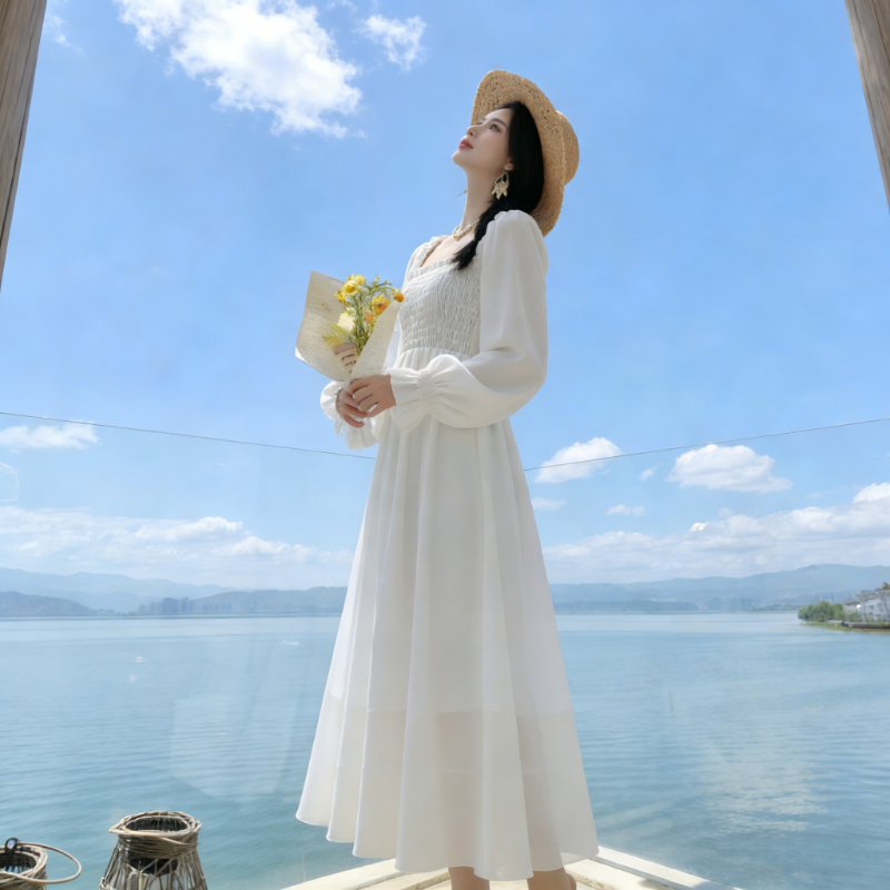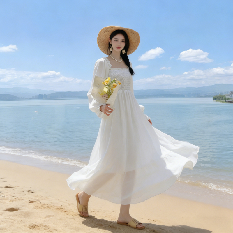 2026年白色长袖方口领连衣裙女新款海边度假沙滩裙裙旅游日常可穿