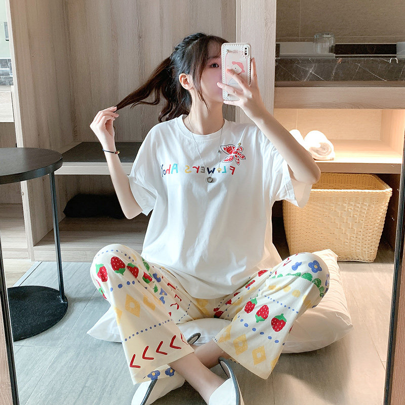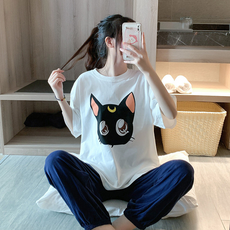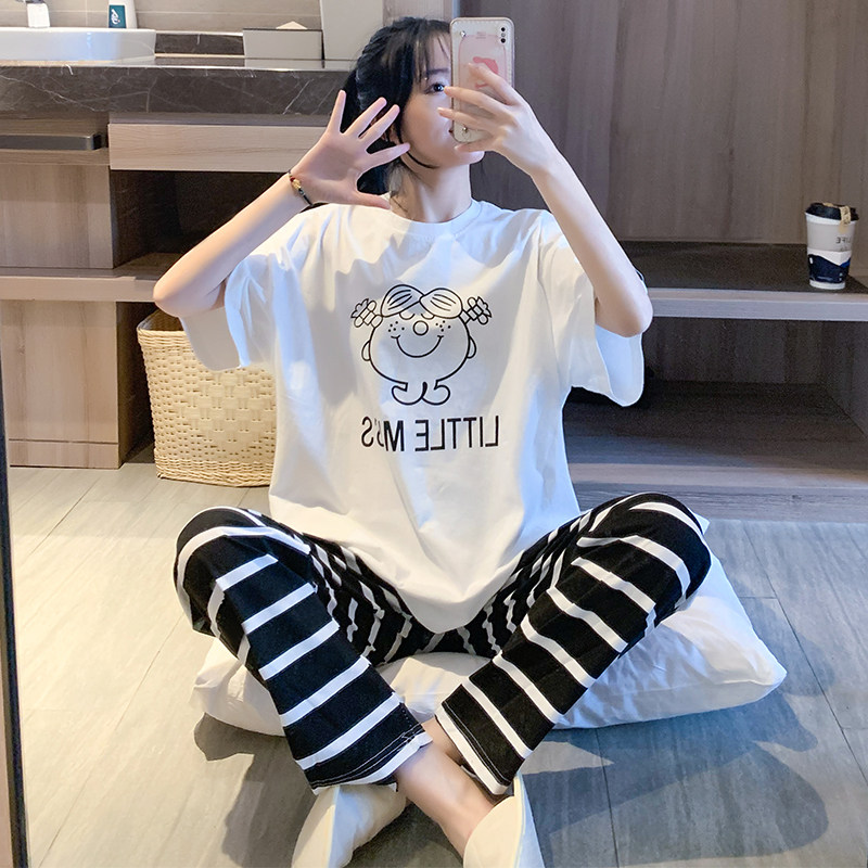 夏季新款韩版纯棉短袖长裤可爱大码学生卡通休闲时尚两件套装女薄