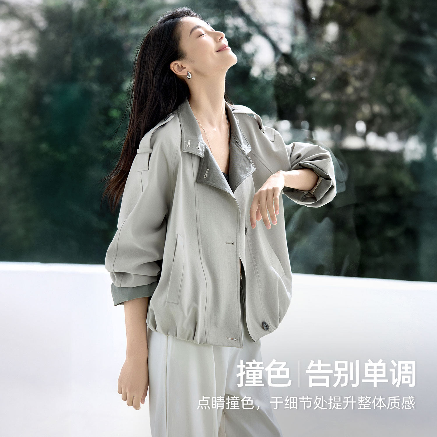 IHIMI海谧立翻领撞色短款夹克外套女款春季挺阔有型显瘦百搭上衣