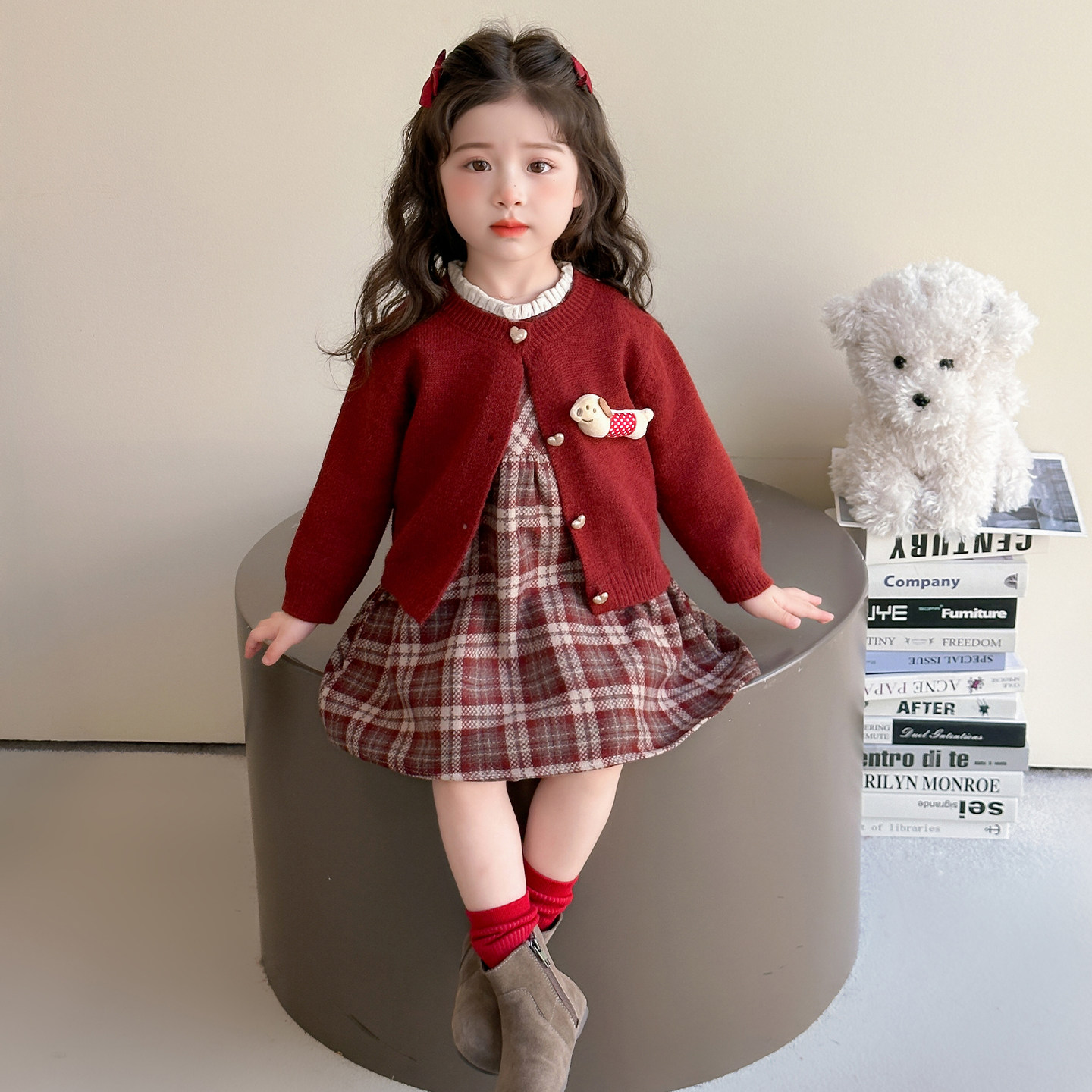 女童连衣裙红色冬装2026新款儿童裙子红格宝宝拜年服新年过年衣服