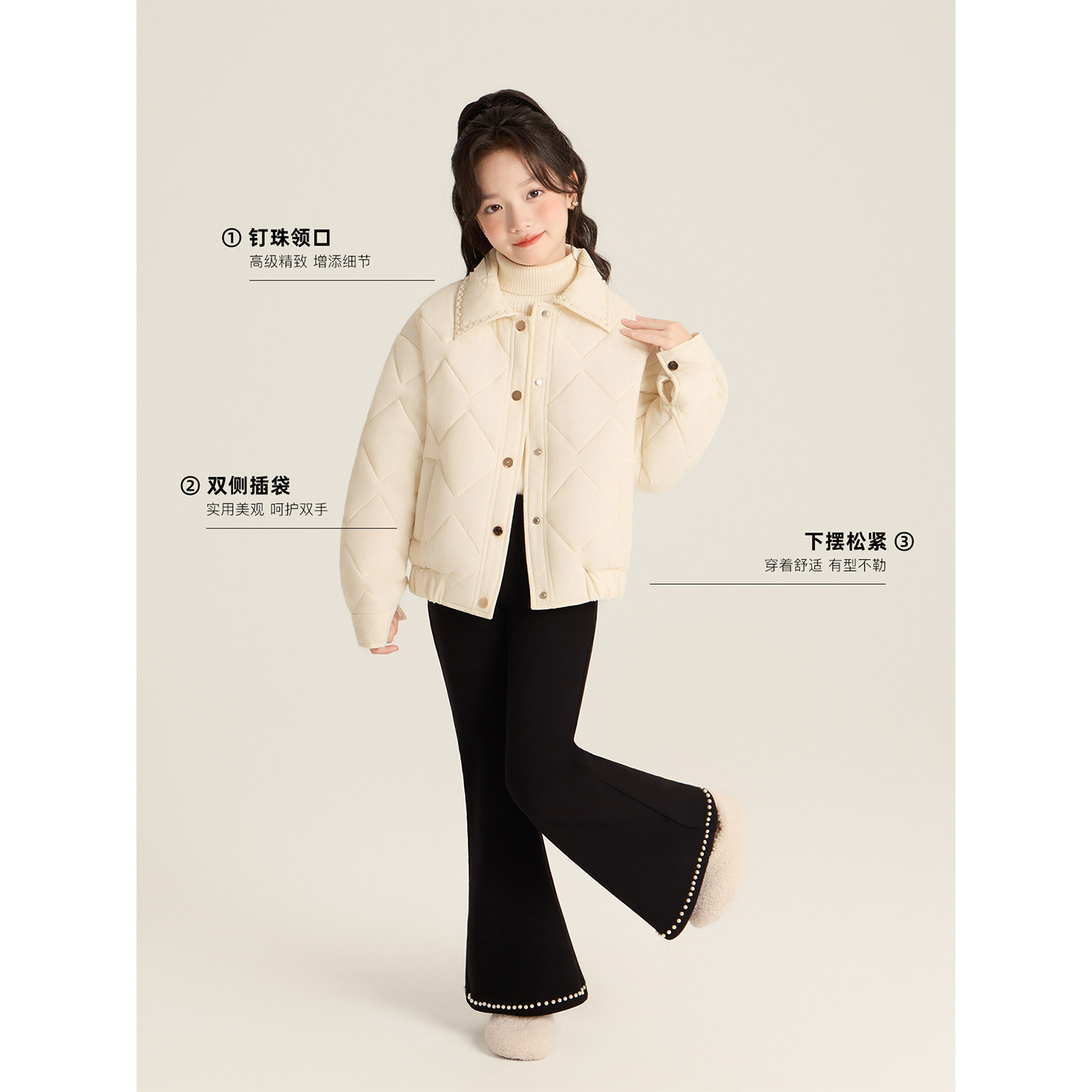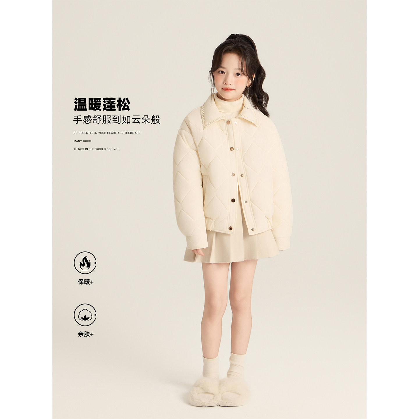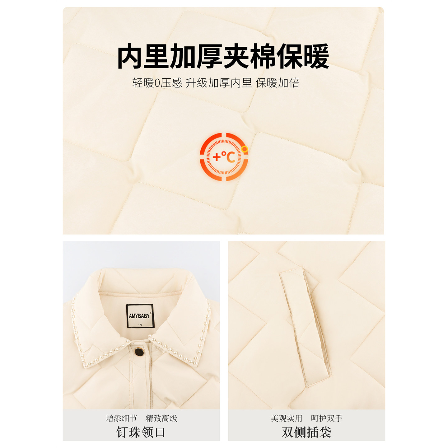 Amybaby女童上衣冬季2025新款小香风珠领加厚菱格保暖棉服外套