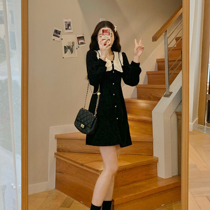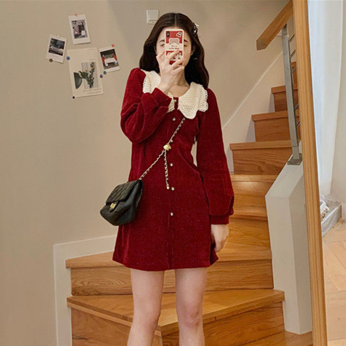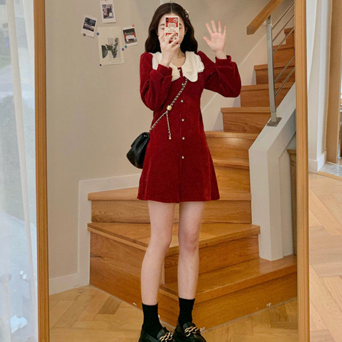 金丝绒节日喜庆女装新年战袍赫本风连衣裙秋冬娃娃领小个子短款裙