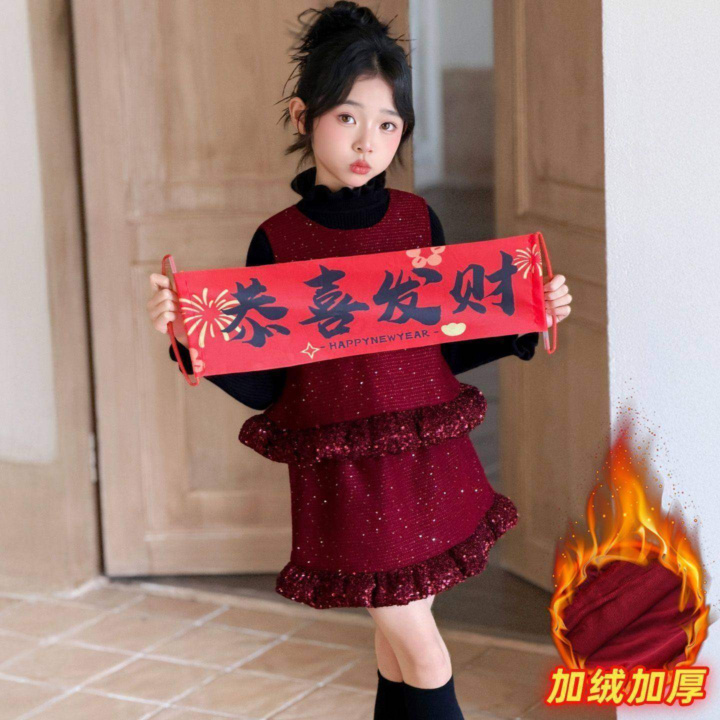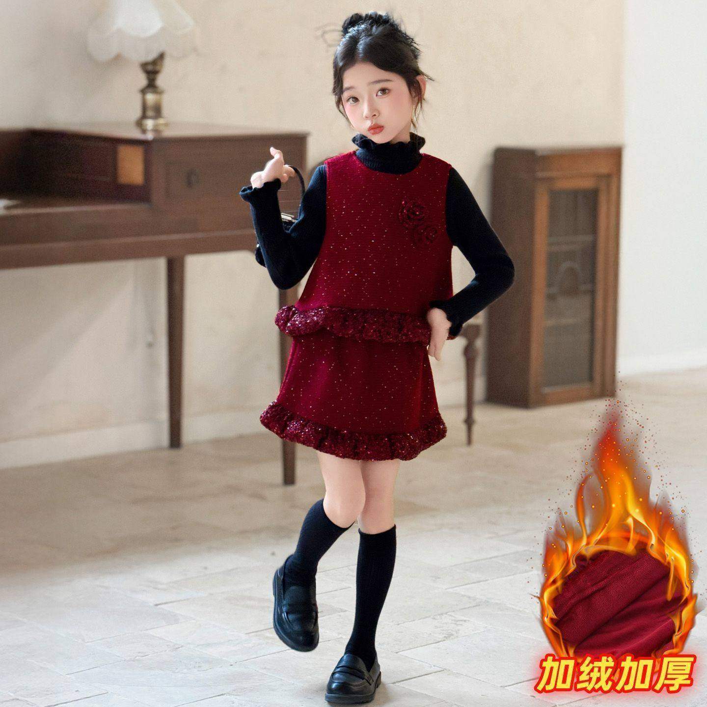 女童秋冬盘花年服裙套装小香风打底衫无袖马甲半身裙加绒三件套