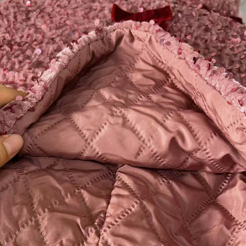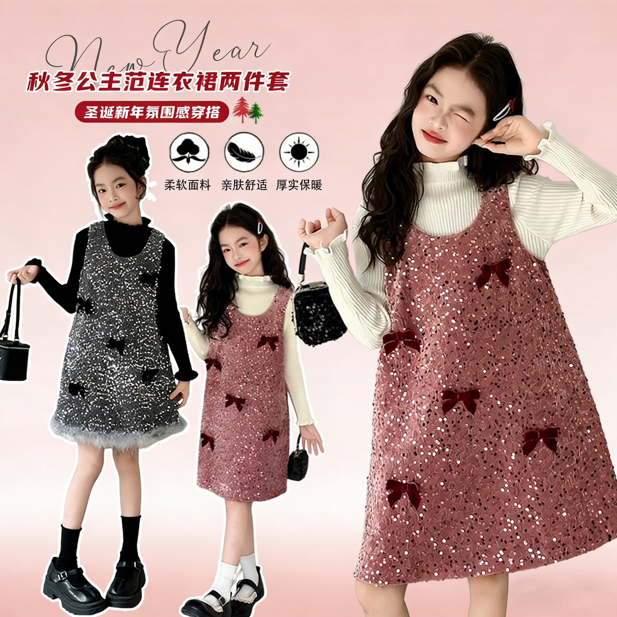 女童冬装新款亮片蝴蝶结套装中大童洋气公主裙加厚背心裙礼服偏小
