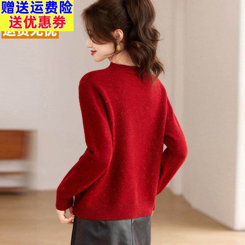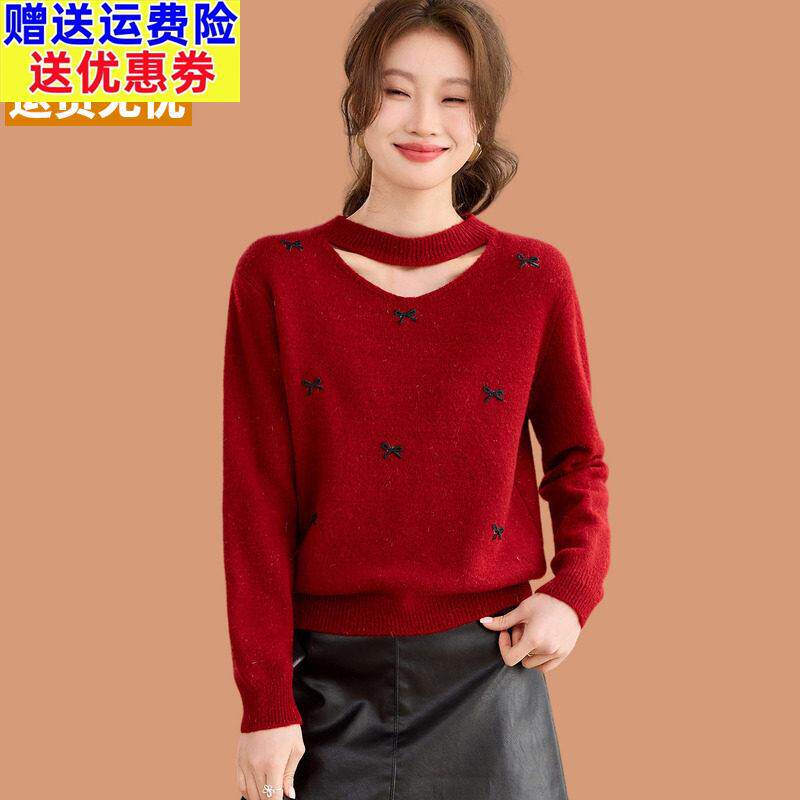 红色毛衣女款2026新款秋冬羊毛打底衫高级设计感挂脖上衣配裙子