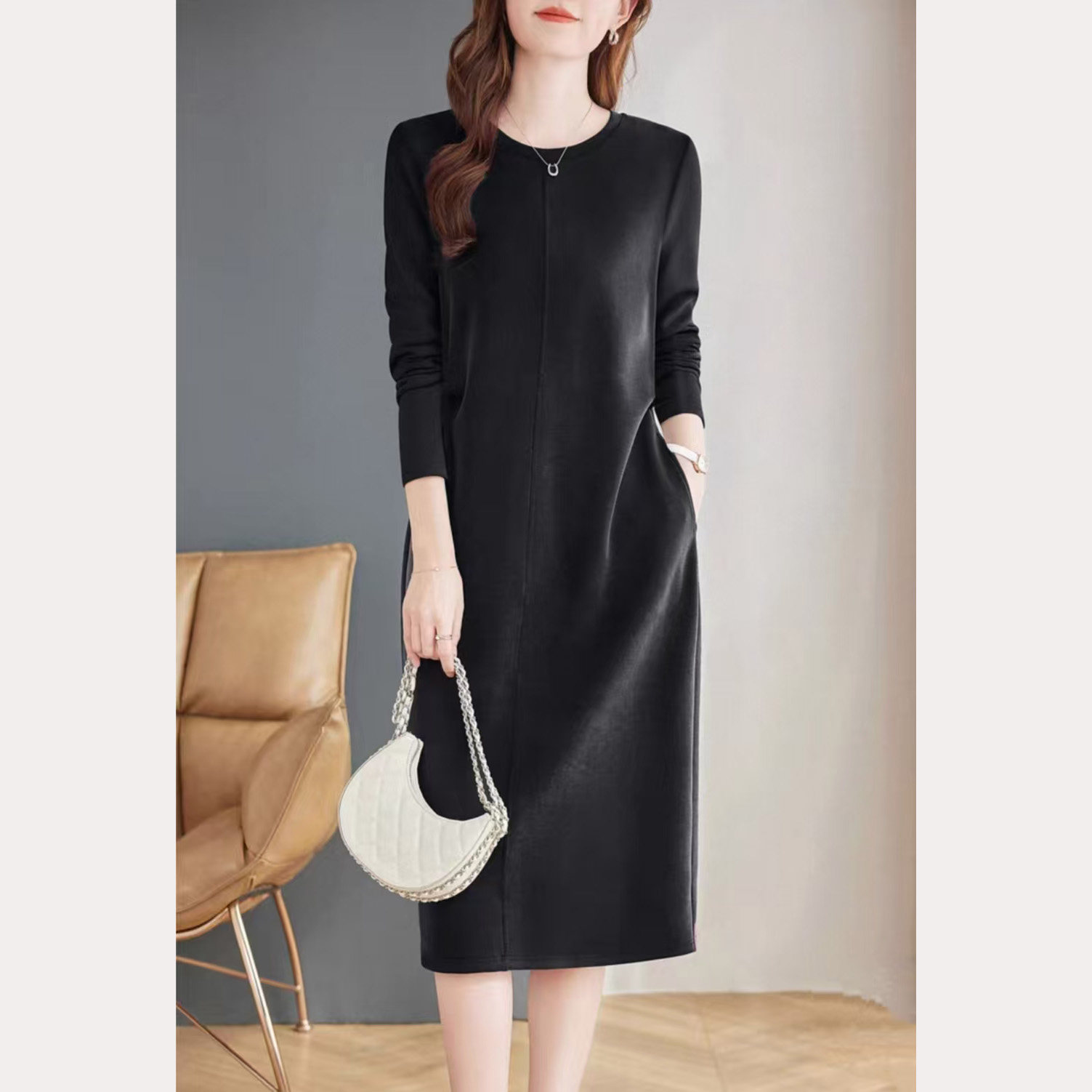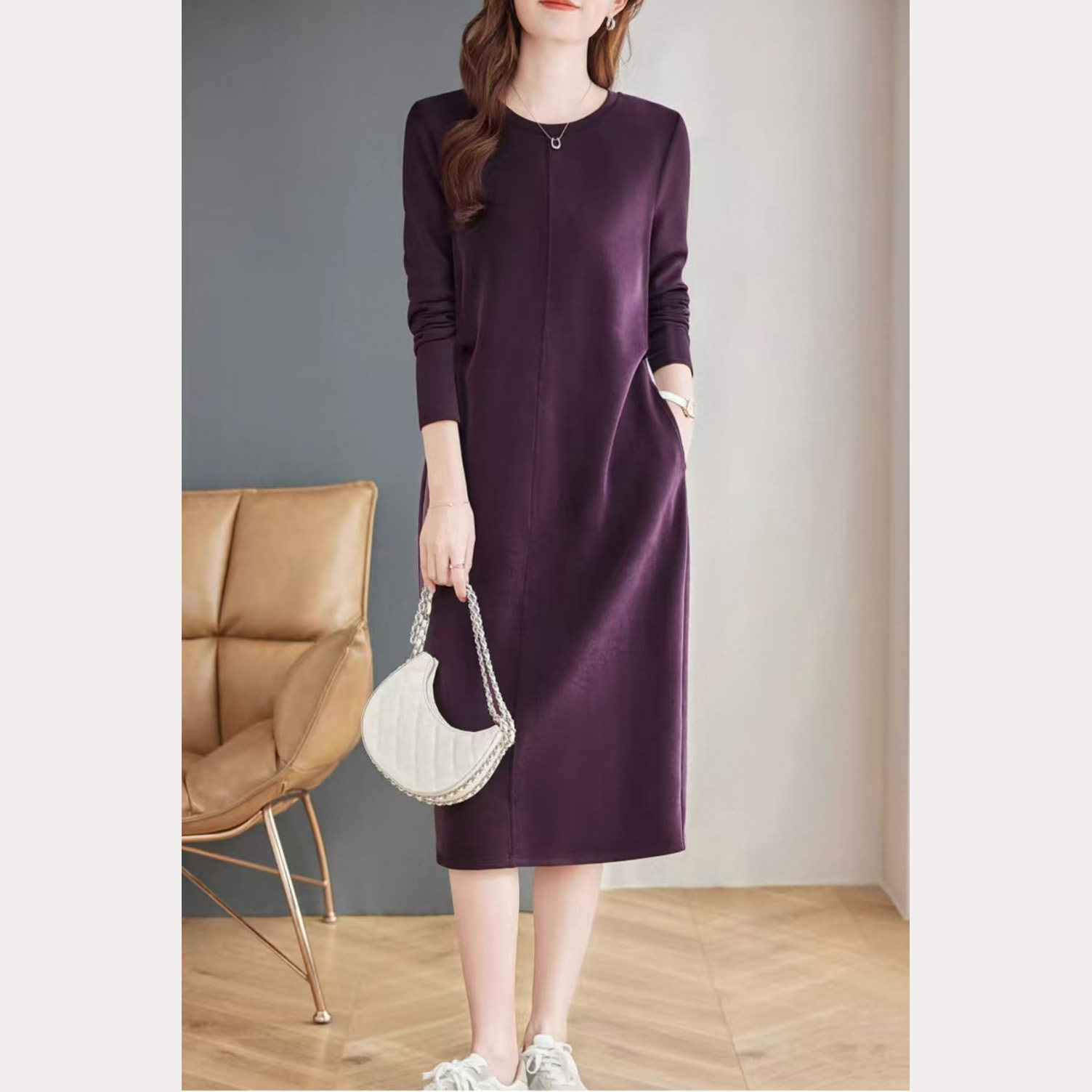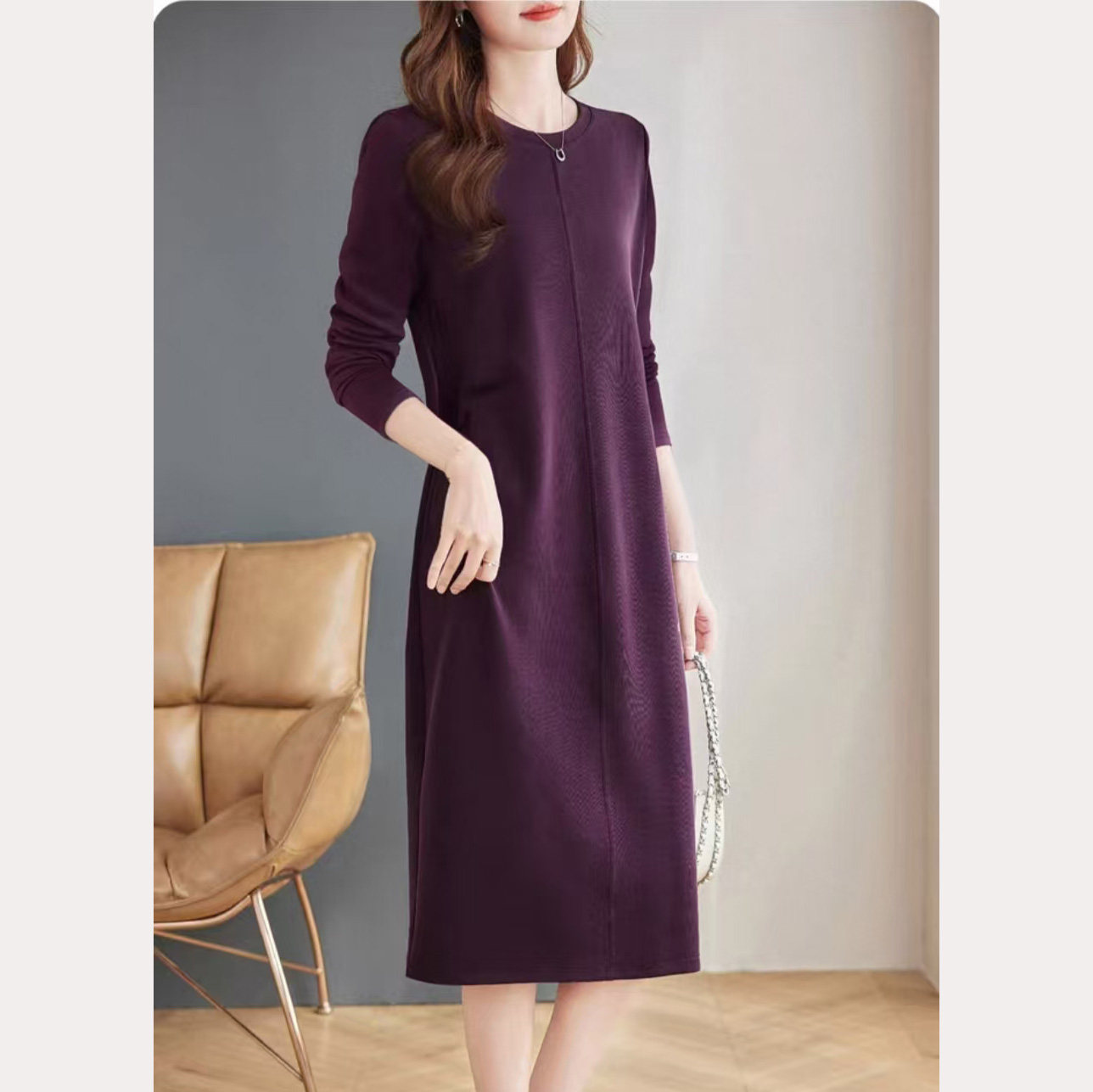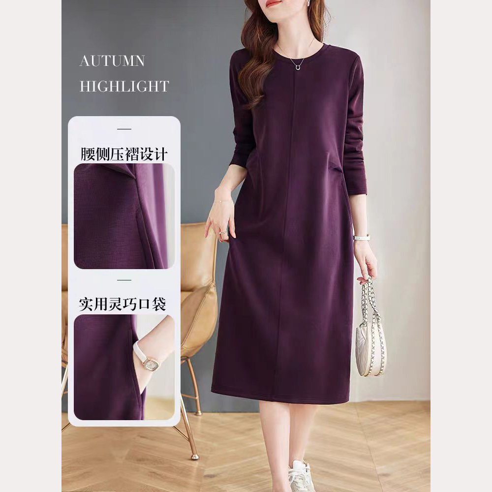 大码女装春秋连衣裙高级感紫色黑色长袖打底单穿中长款显瘦遮肚裙