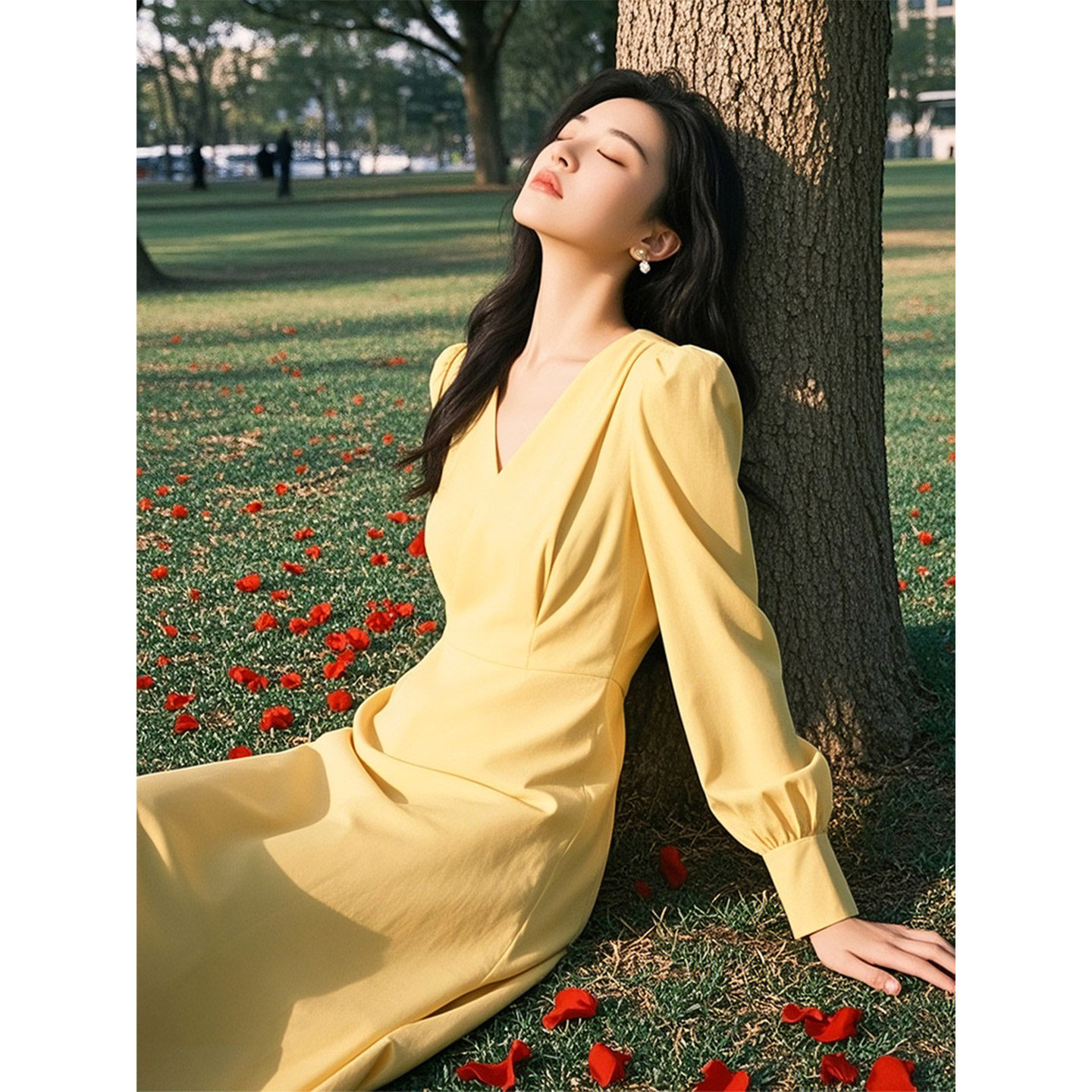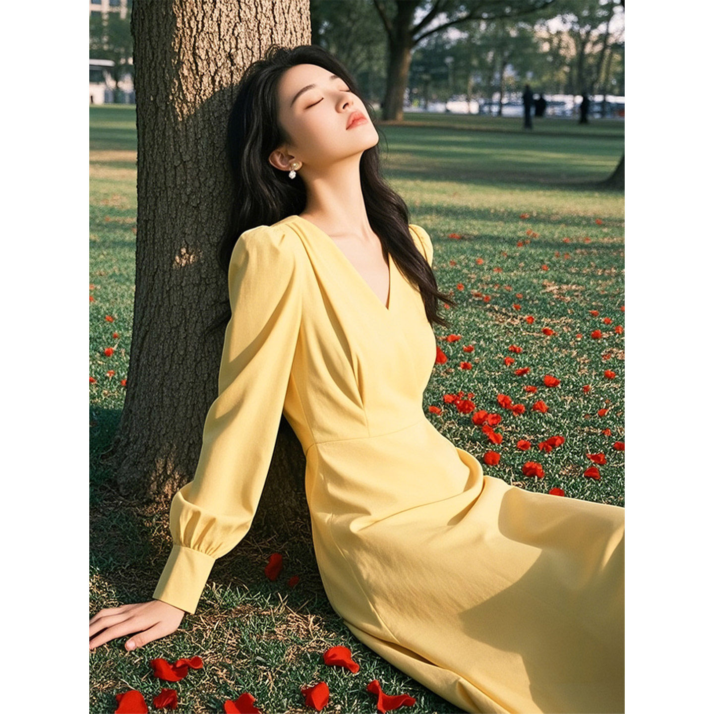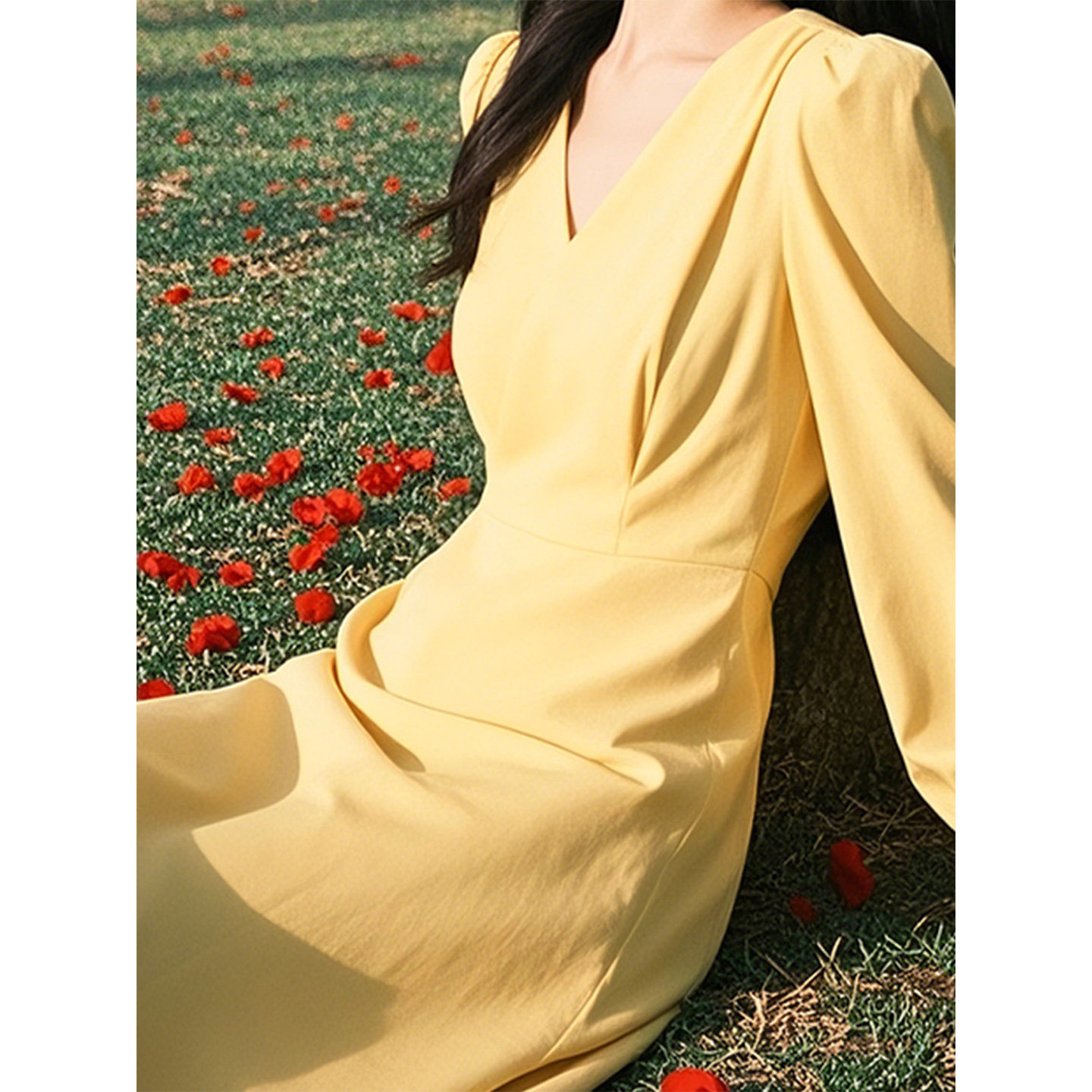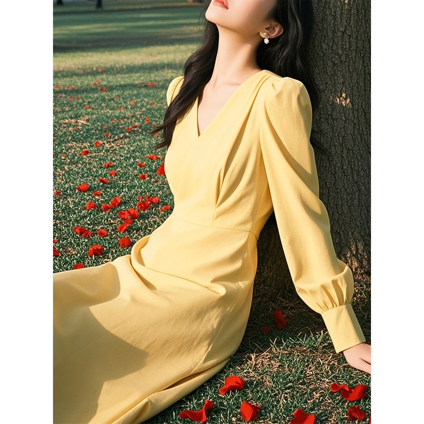 法式奶黄色V领连衣裙女2026年春季新款收腰中长款气质早秋A字裙子