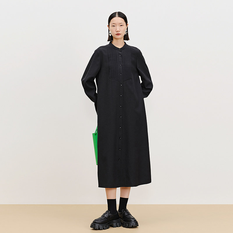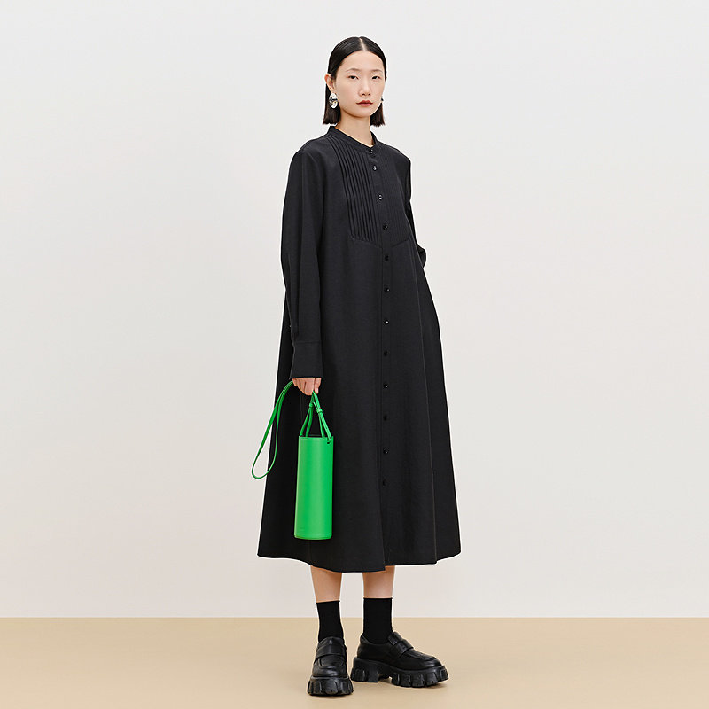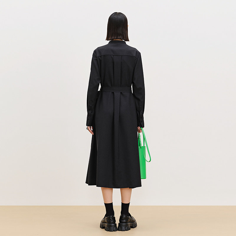 【天猫臻选】AUM噢姆春季麻感打条文艺立领黑色连衣裙长裙女