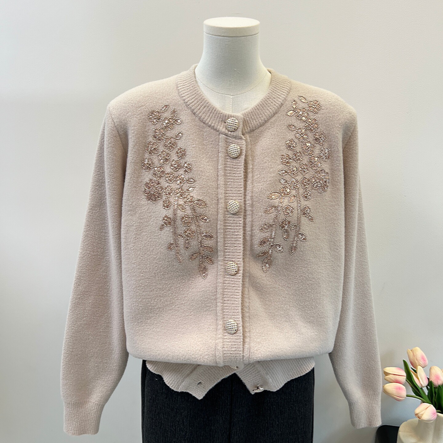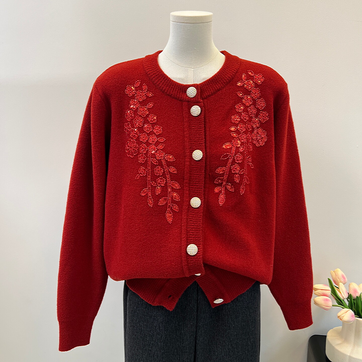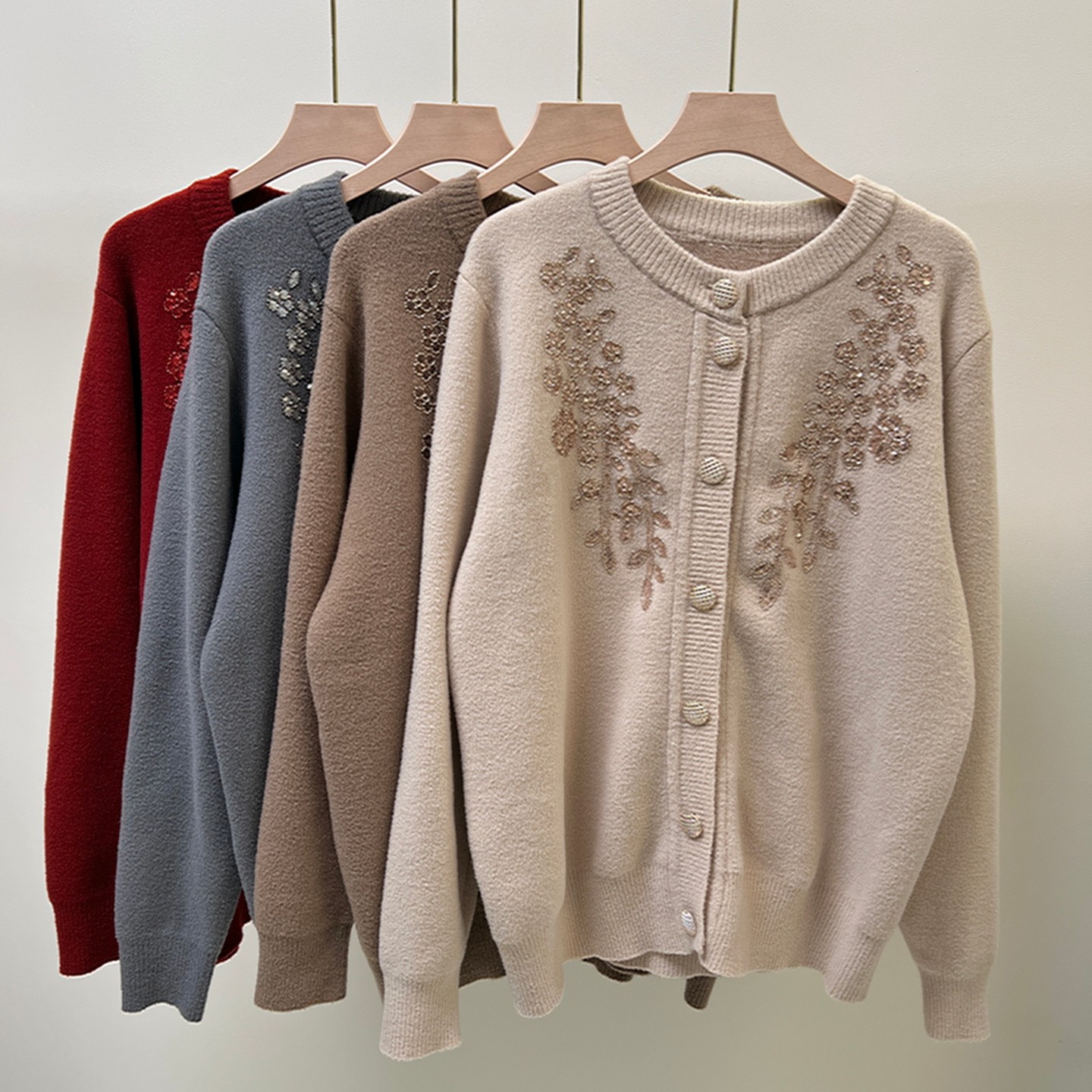 洋气妈妈装秋冬新款绣花加绒加厚上衣针织开衫中老年女装毛衣外套