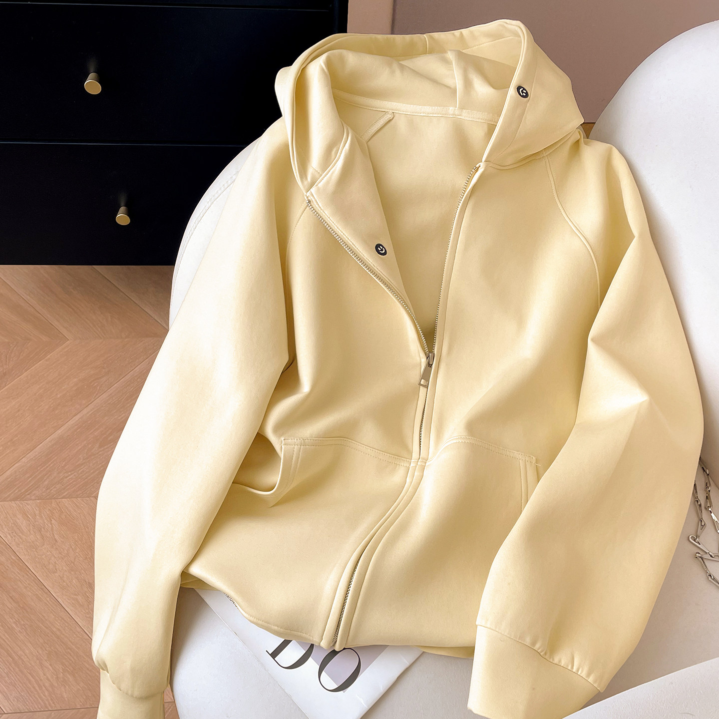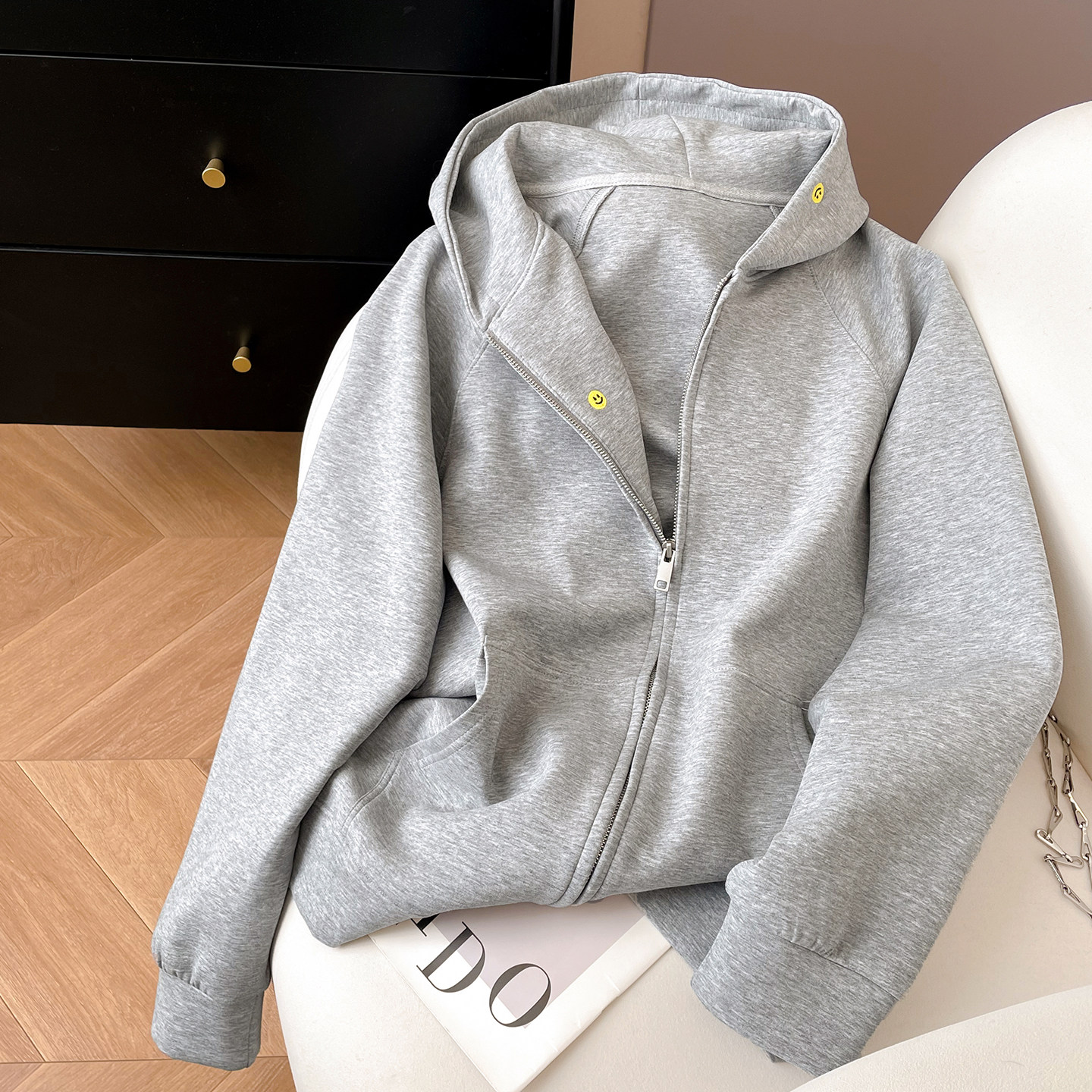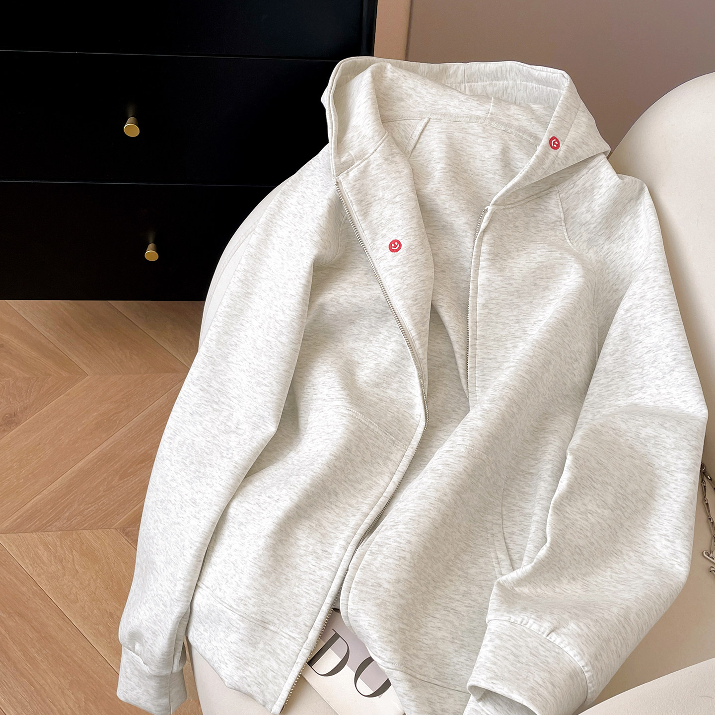 小C家 笑脸刺绣连帽卫衣女款2026新款春季宽松插肩袖拉链开衫外套