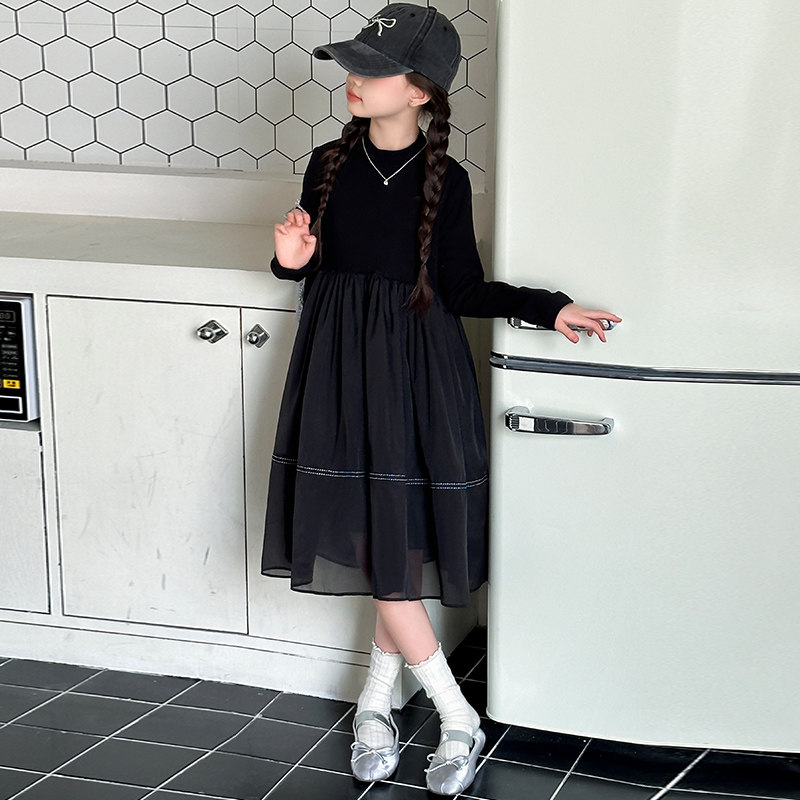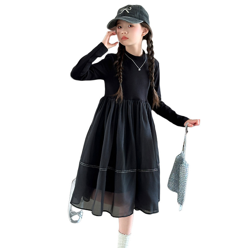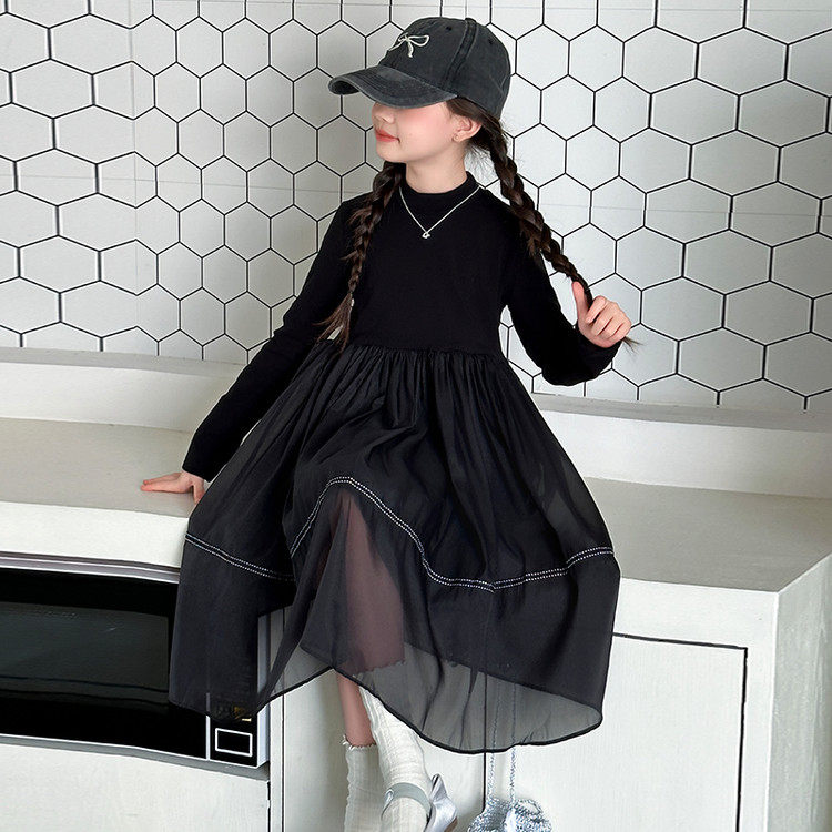 女童长袖连衣裙纱裙春秋款黑色打底衫裙2025新款韩版中大童公主裙