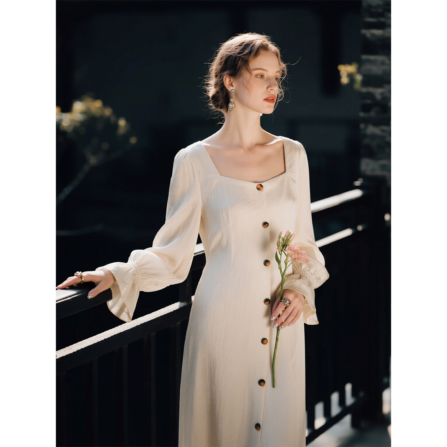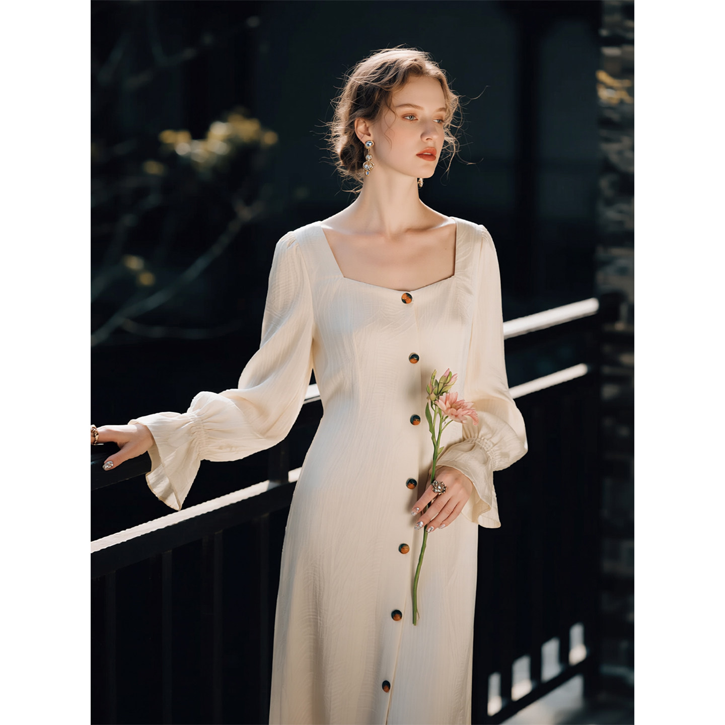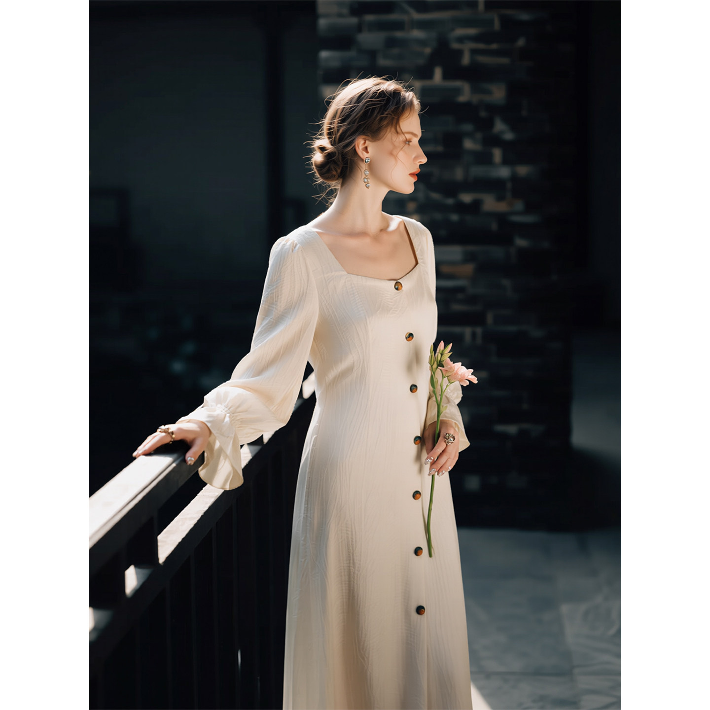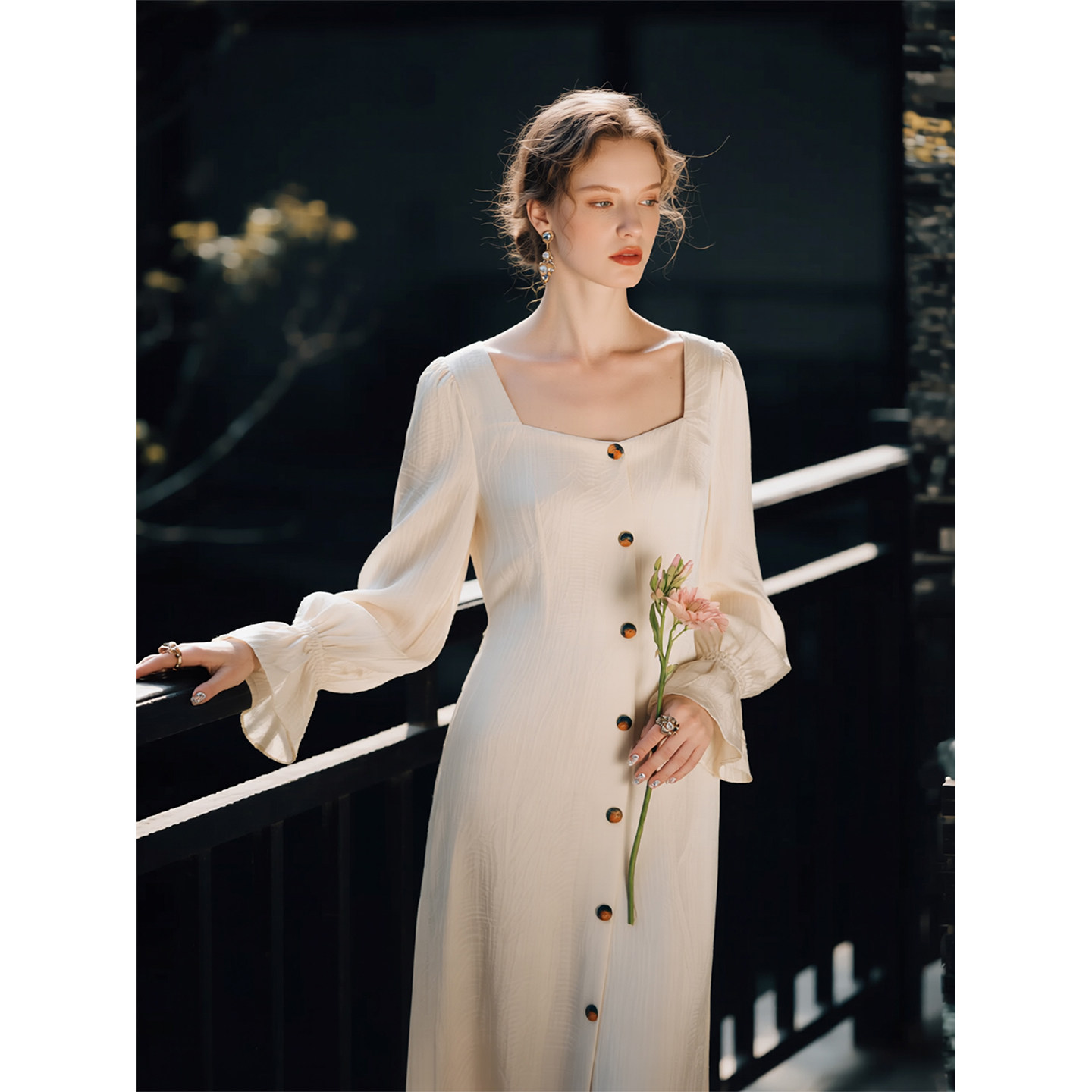 白色方领长袖连衣裙女2026年春季新款轻奢高级感气质收腰显瘦长裙