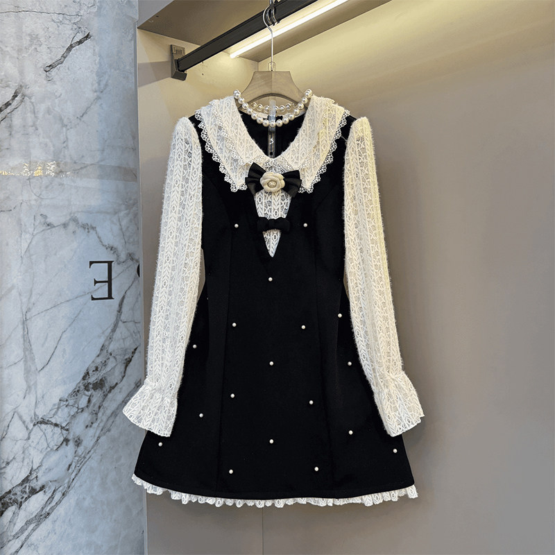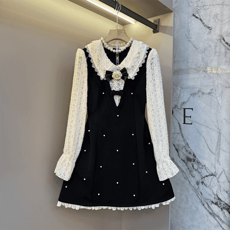 胖MM拼色翻领植绒长袖假两件连衣裙加肥中长款显瘦减龄甜美淑女裙