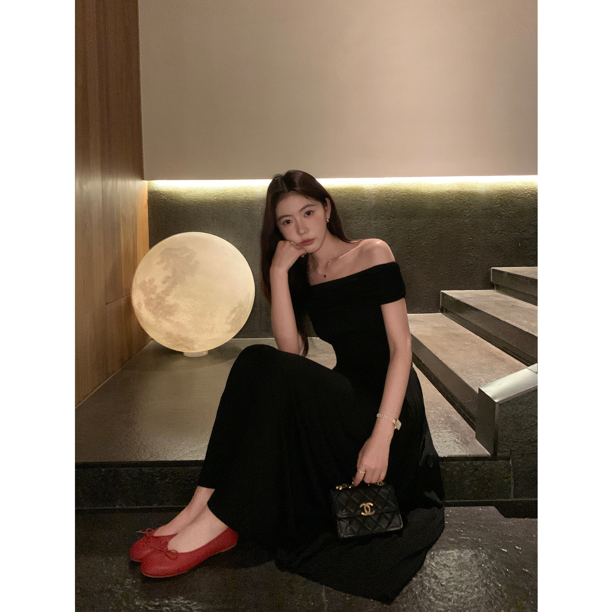 pusumede 黑色高级感一字肩连衣裙女夏法式气质收腰显瘦露肩长裙