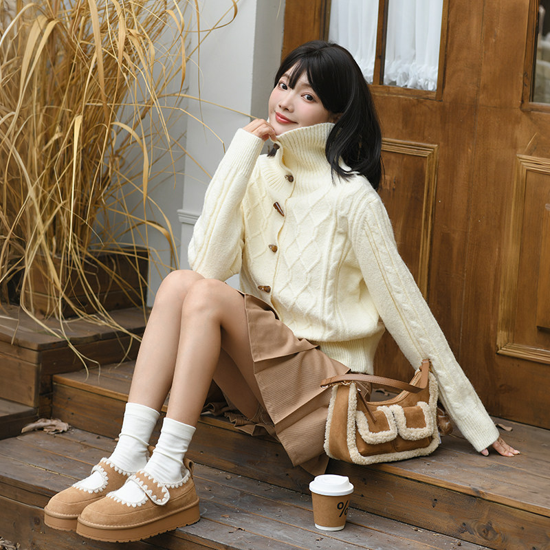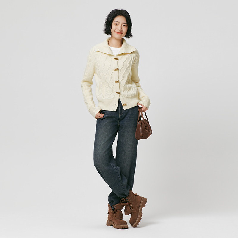 热风女士针织衫毛衣2025年冬季新款复古学院牛角扣翻领针织开衫