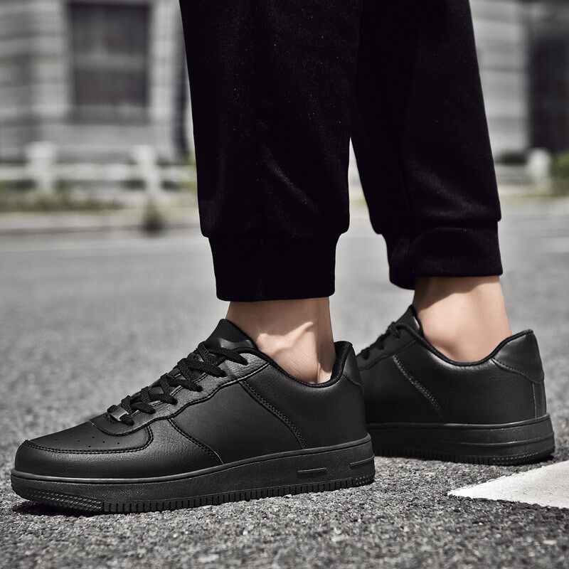 纯黑工地上班鞋男不累脚软底全黑色板鞋男士休闲皮鞋子男透气平底