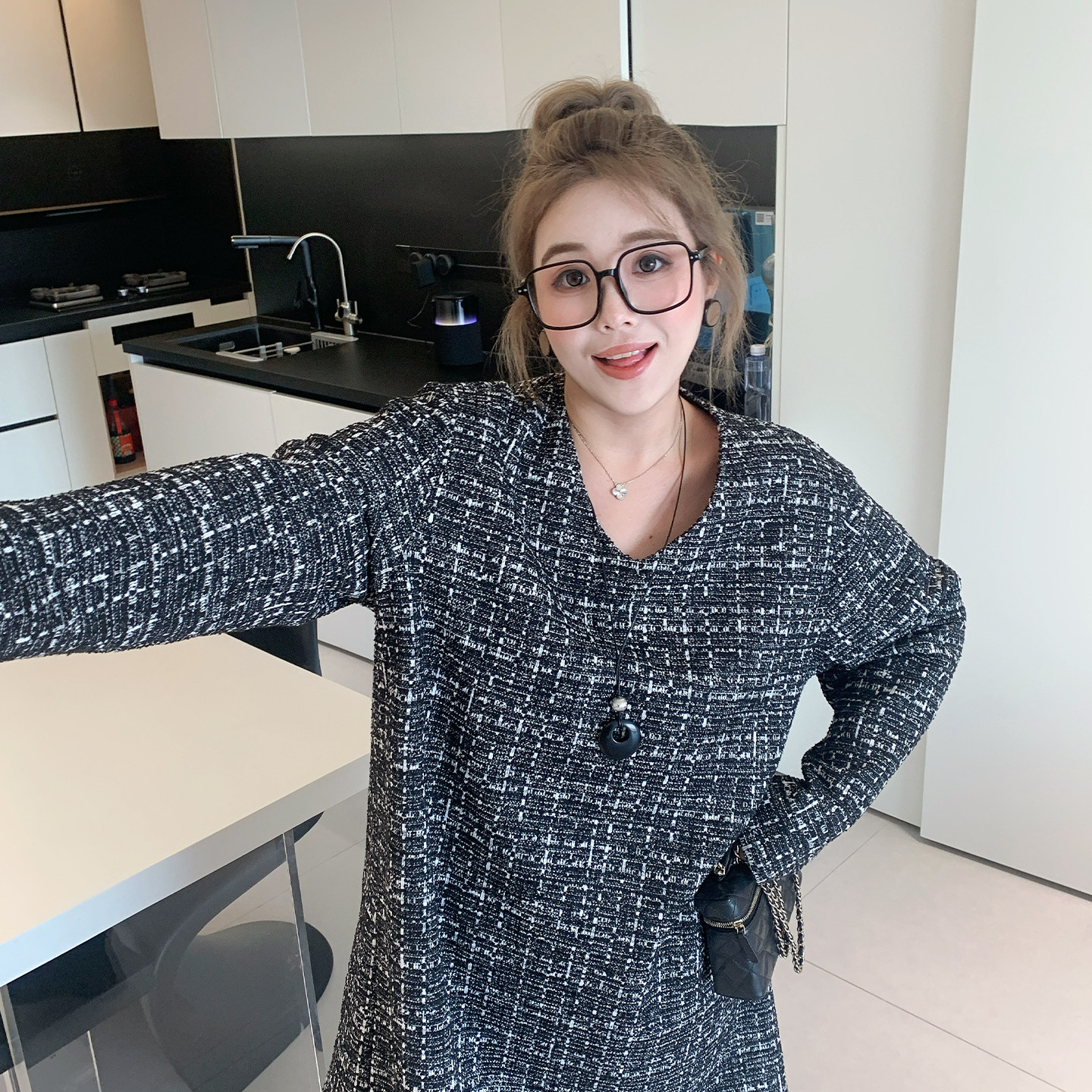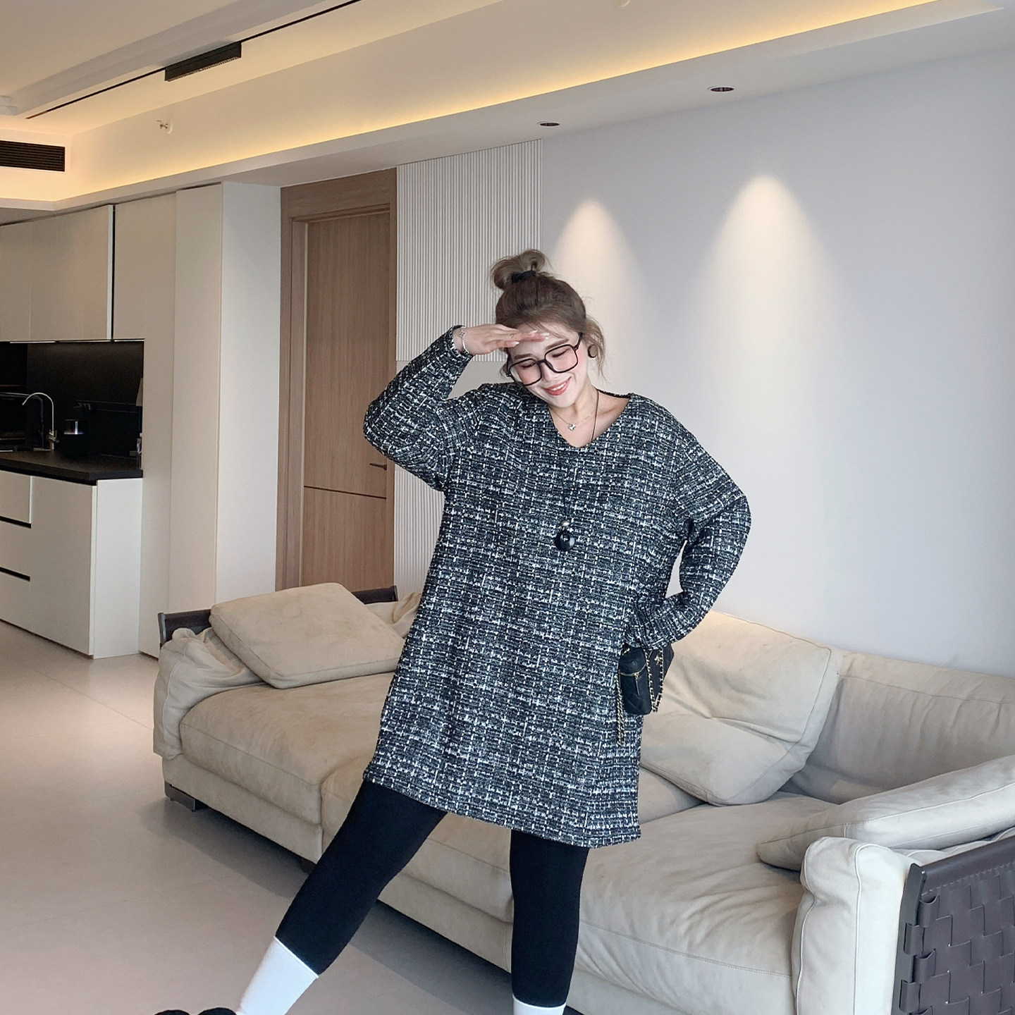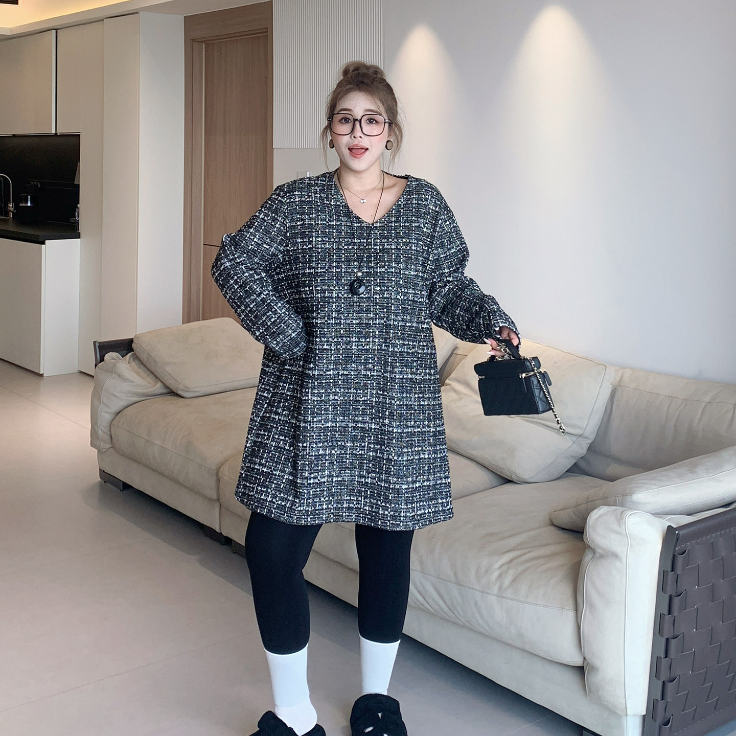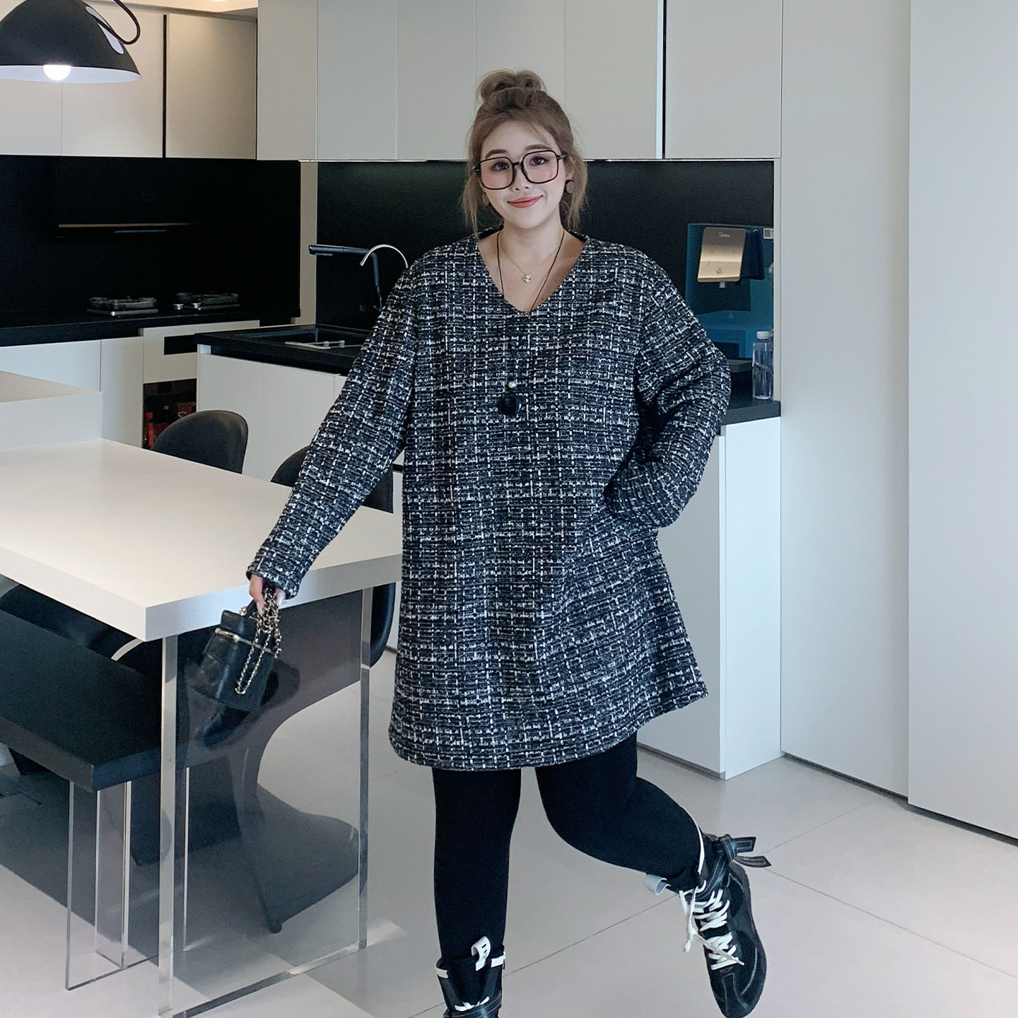 【年末7折】媛子大码冬季胖mm中长款v领中长款加绒小香风连衣裙女