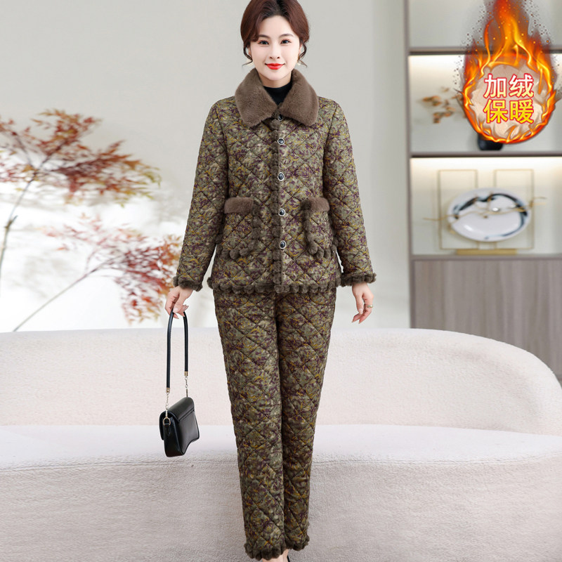 中年妈妈棉衣加绒套装2025新款中老年女装冬装加绒外套裤子洋气