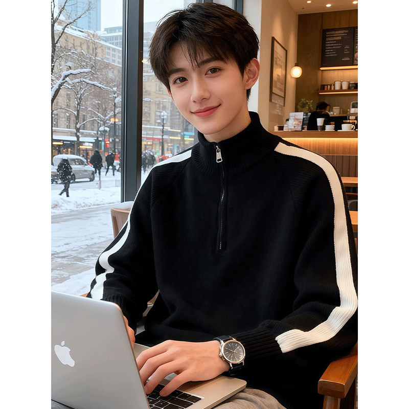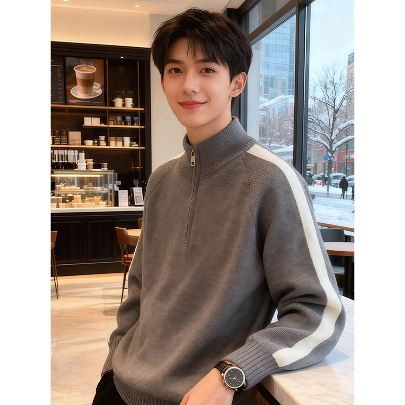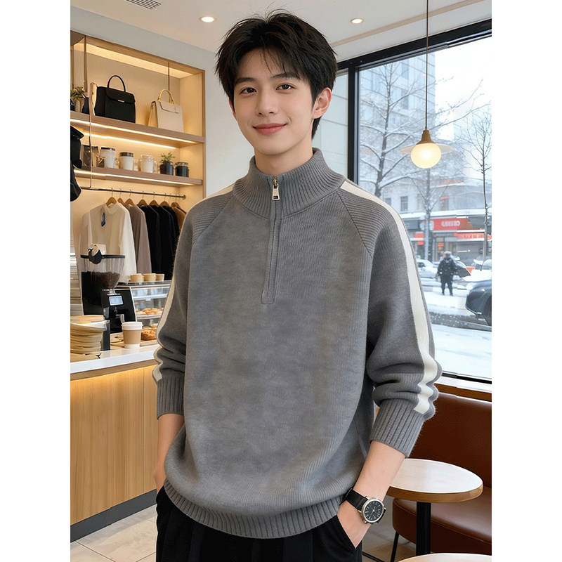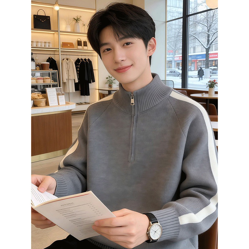 灰色撞色半高领毛衣男款冬季美式立领半拉链针织衫慵懒内搭打底衫