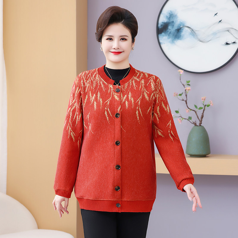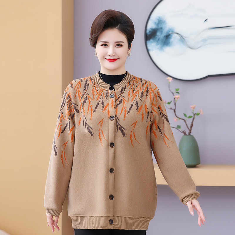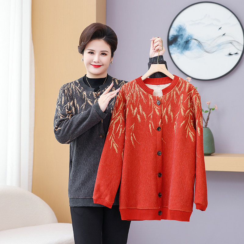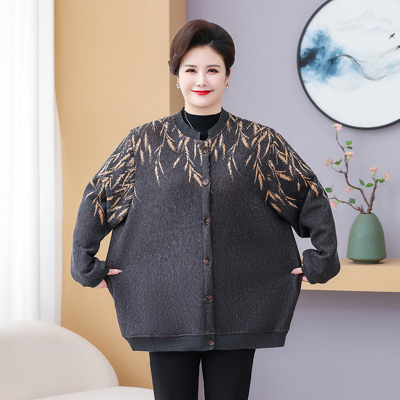 妈妈秋装新款加绒外套大码奶奶宽松上衣服中老年针织衫秋冬厚毛衣